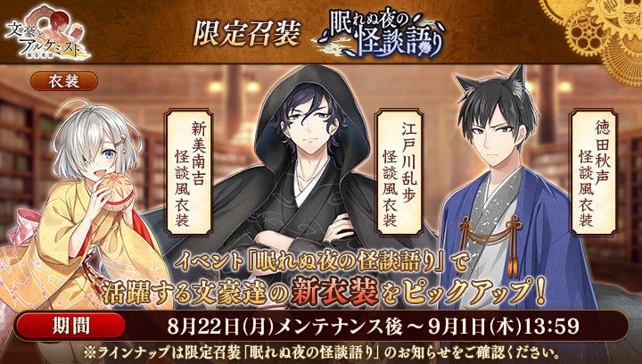 さらに、イベントと同時に開催される限定召装「眠れぬ夜の怪談語り」にて新規追加された「江戸川乱歩」「新美南吉」「徳田秋声」の〈怪談風衣装〉を編成すると、得点の獲得率がそれぞれ30%上昇します。