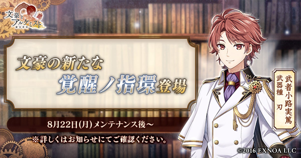 合同会社EXNOA(本社:東京都港区、CEO:村中 悠介、URL:https://games.dmm.com/)が運営するDMM GAMESは、8月22日(月)より、女性向け文豪転生シミュレーションゲーム「文豪とアルケミスト」において、武者小路実篤の新たな「覚醒ノ指環」が登場いたしました。