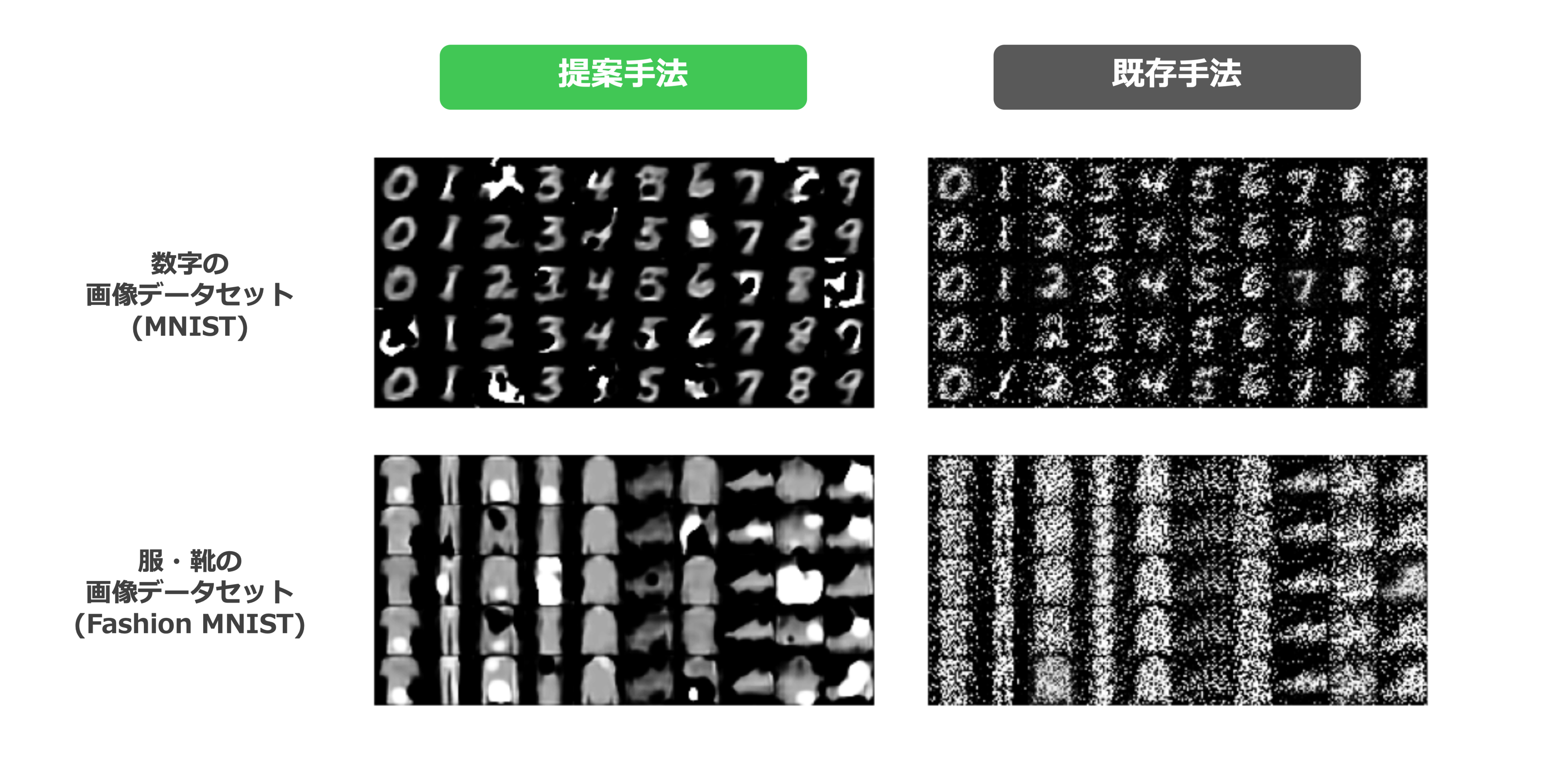 提案手法のほうが、より本物に近い画像の生成を実現しており、性能が優れていることを示しています。