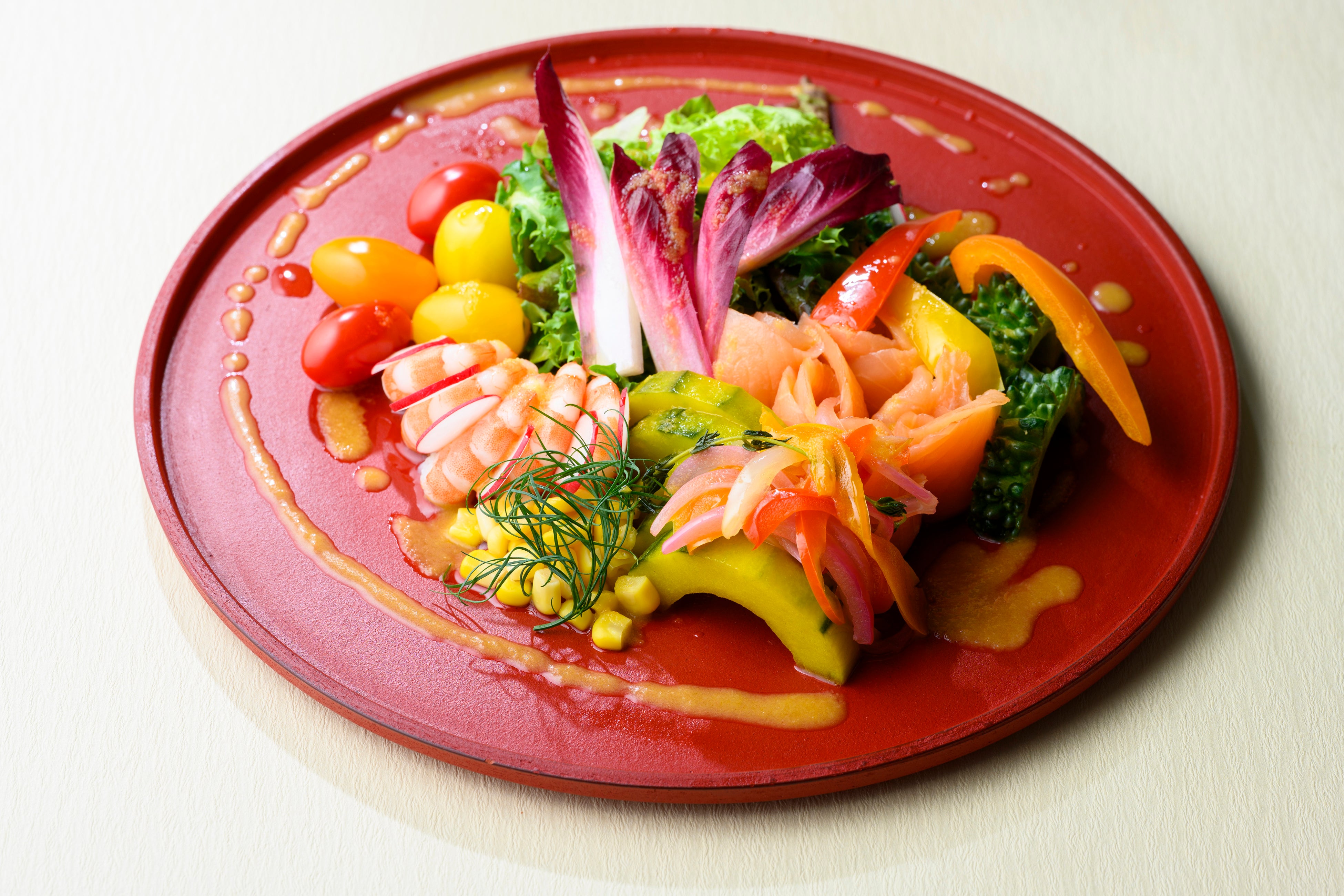 ・彩り野菜とシーフードのサラダ仕立て 野菜のすりおろしドレッシング