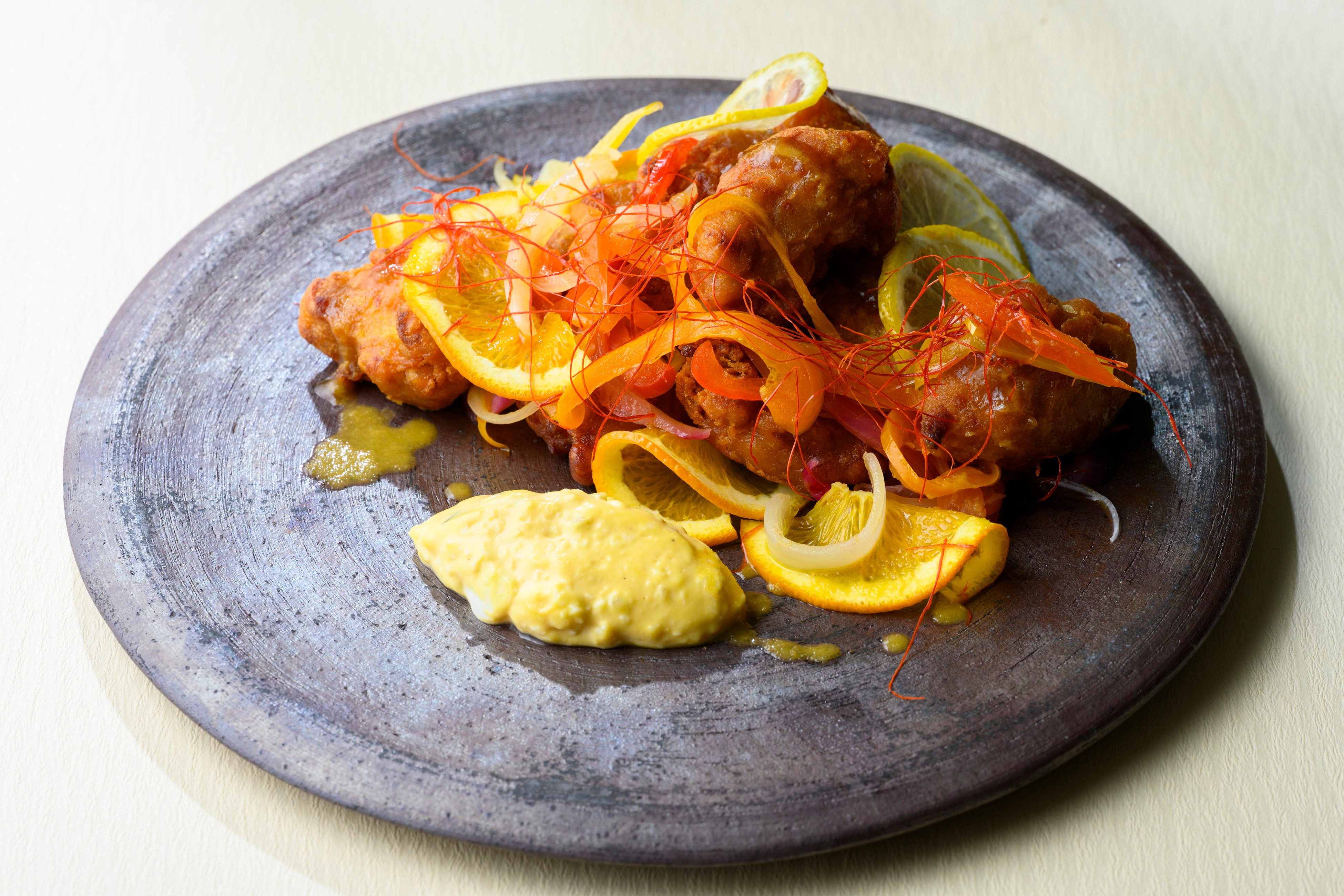 お料理は全てスタッフが席にお持ちしますので、ゆっくりと食事を楽しむことができます。アヒージョは、オリーブオイルやにんにくと一緒に富山名産の珍味であるほたるいかの沖漬けやいかの黒作りを一緒に熱し、香ばしさの中に発酵のコクをプラスした一品です。「富山の夏をもっと楽しんでいただけるよう、地元の食材も使ってお酒が進む一皿をつくりました。キンキンに冷えたビールとともにこだわりの料理をお楽しみください」(料理長・東 宗史)