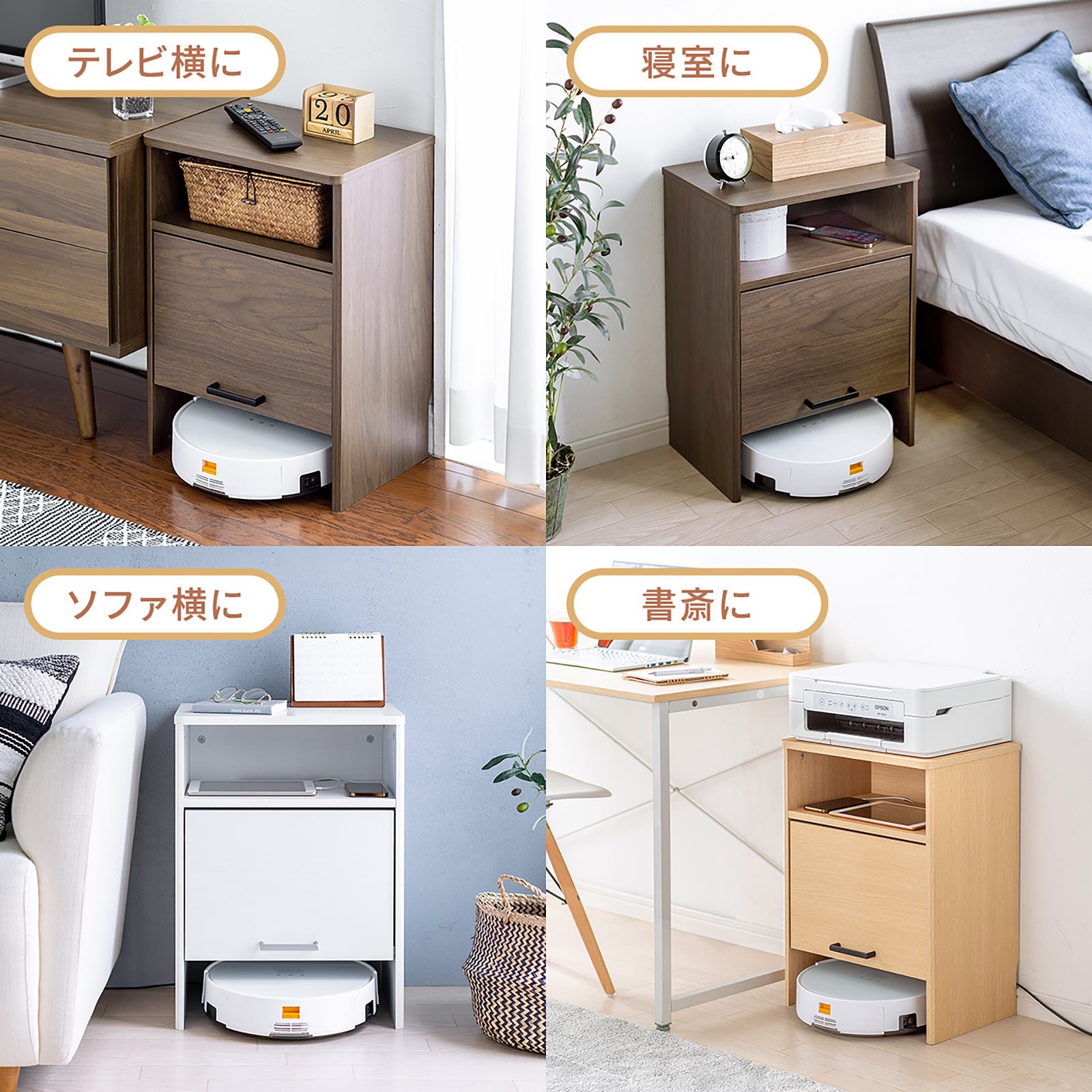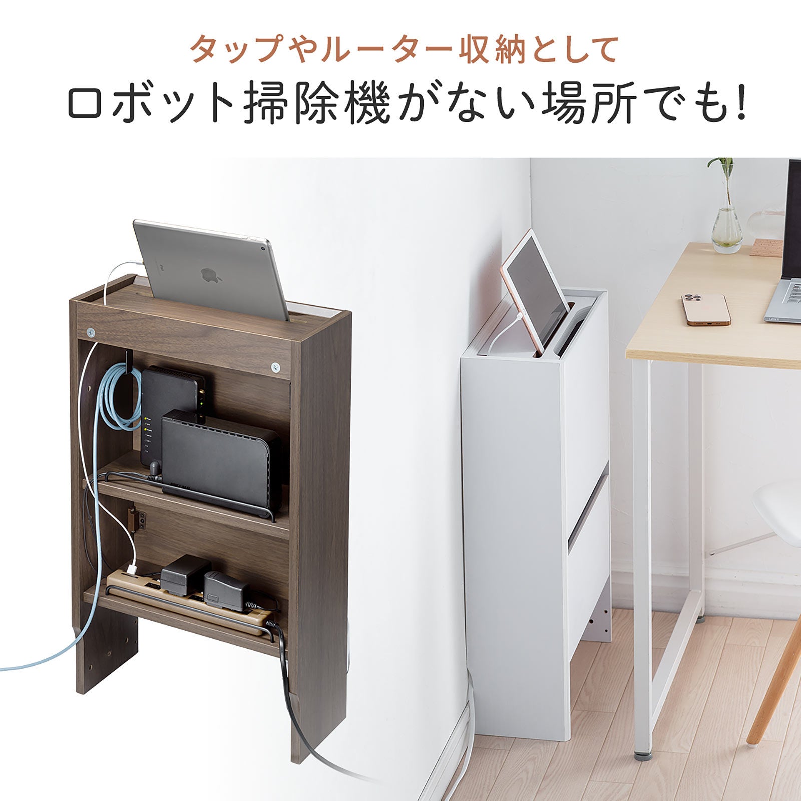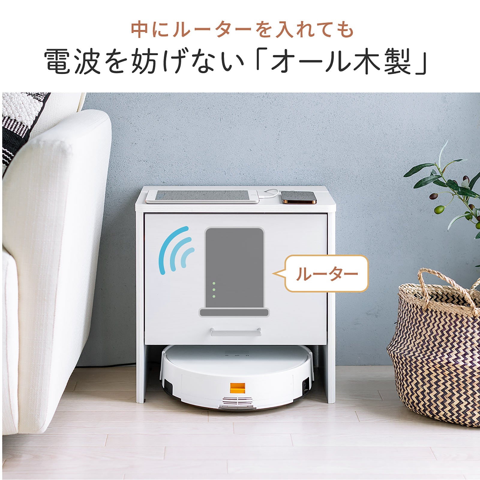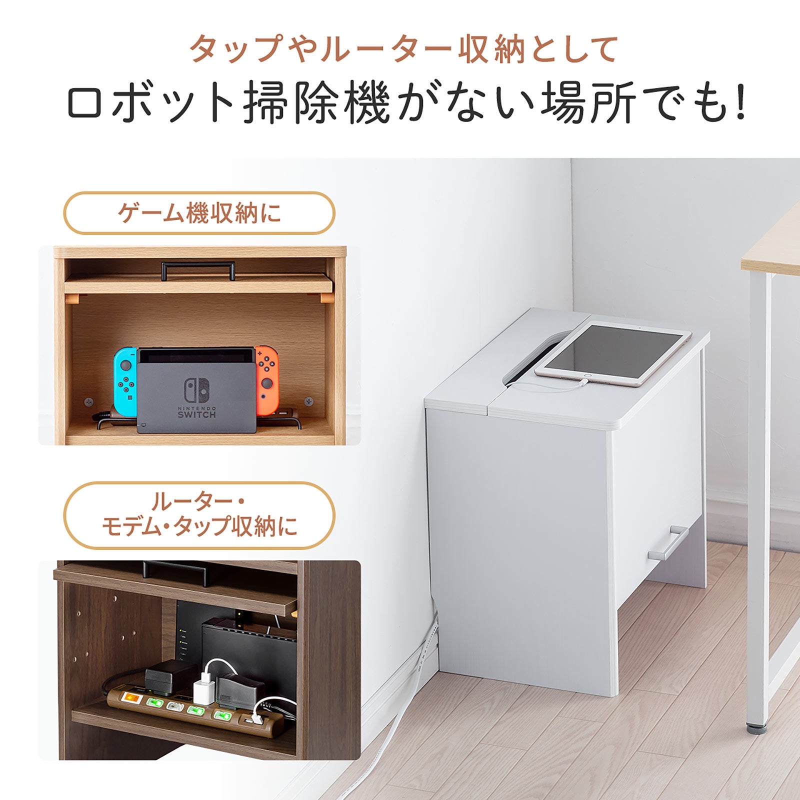 本製品はケーブルや電源タップ、Wi-Fiルーターなどが綺麗に収納ができる木製の収納ボックスです。またごちゃごちゃしがちなケーブルをキレイにし見た目もスッキリさせることができます。また組み立て方の一例としてロボット掃除機を下部に設置することが可能です。