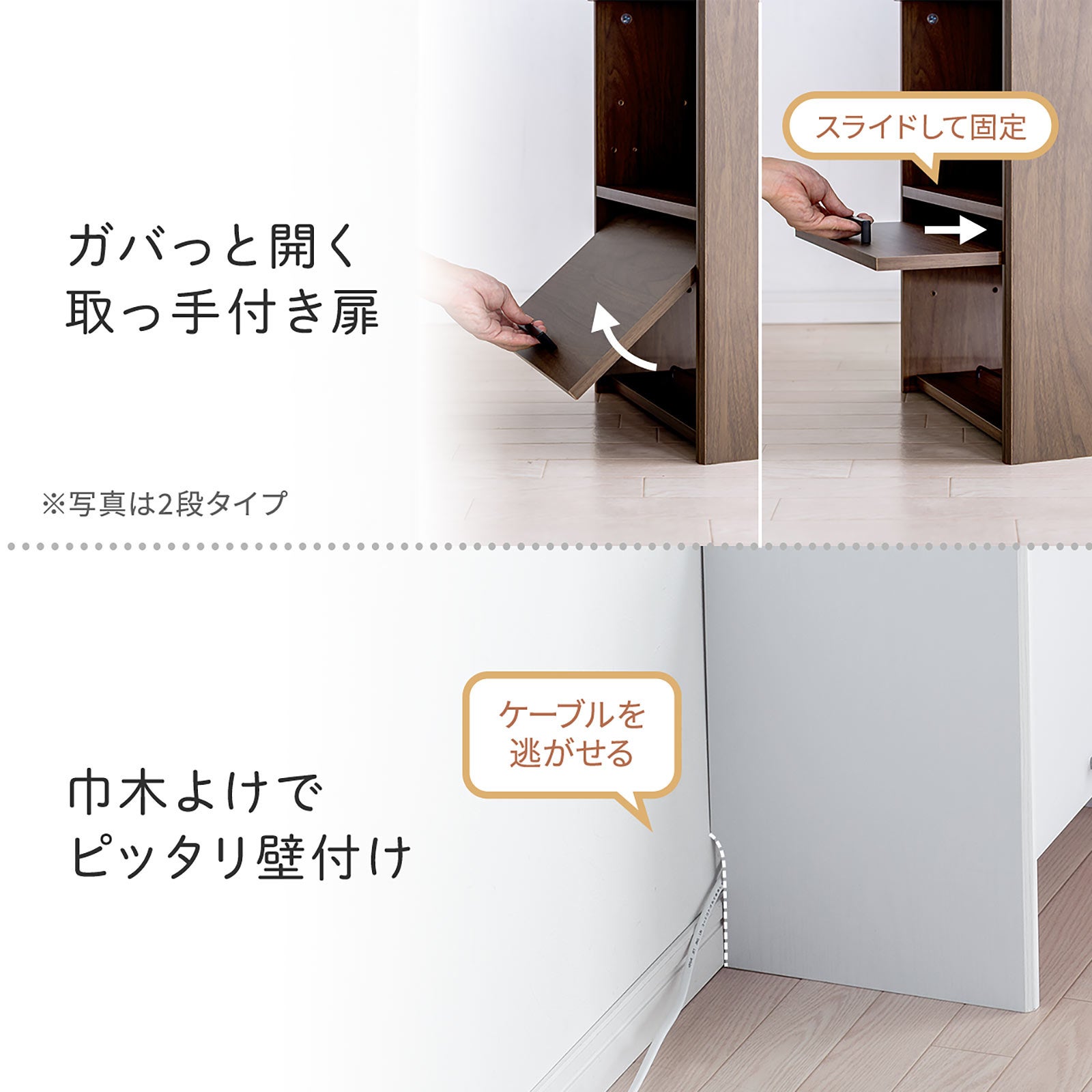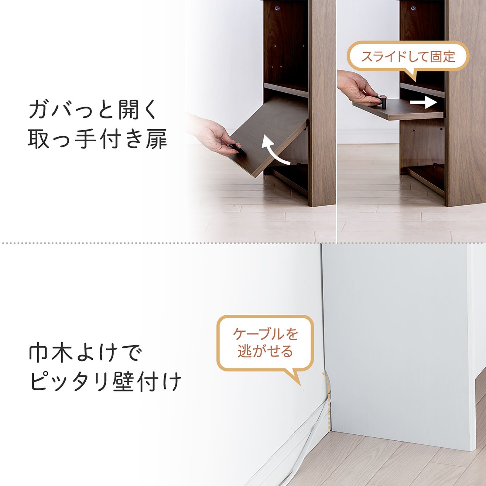 200-CB025WMの天板は、スリットがないフラットとタブレットやスマートフォンをスタンドできる2WAYで使用可能です。そして正面マグネット開閉式扉でタップのスイッチのON/OFFが簡単に行え、機器のメンテナンスや配線の組み替えも楽に行えます。上面はスマートフォンやタブレットの充電ケーブルを通しておけるスリットが付いており、充電時に便利です。