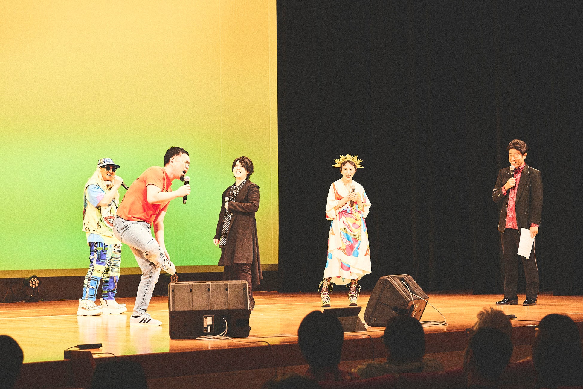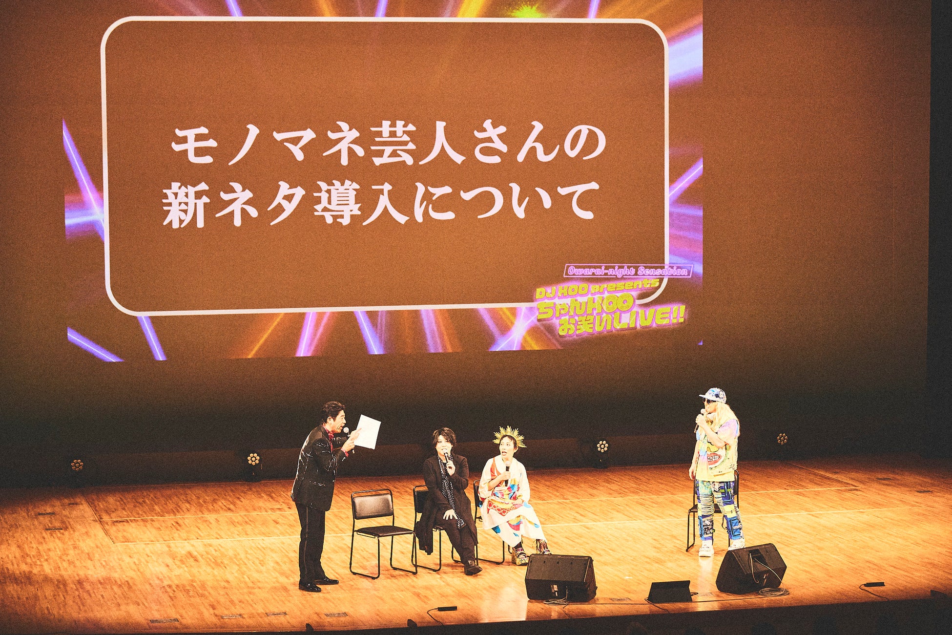 ラストを飾るのは芸歴30年を迎えた原口あきまさ。登場だけで会場を沸かせる圧巻の存在感を見せつけると、おなじみのとんねるずモノマネに観客は大喜び。桃太郎を題材にしたモノマネメドレーでは、明石家さんま、出川哲朗、三村マサカズ(さまぁ~ず)など、絶妙に特徴を捉えた登場人物たちが物語を展開。さらに、音楽に乗せて、音だけで志村けんや柳沢慎吾らさまざまなタレントやミュージシャンのモノマネをしてみせるテクニックに観客は終始笑いっぱなし。三者三様のモノマネネタをたっぷり堪能したDJ KOOは「今日は最KOOですね!」と感激していました。
