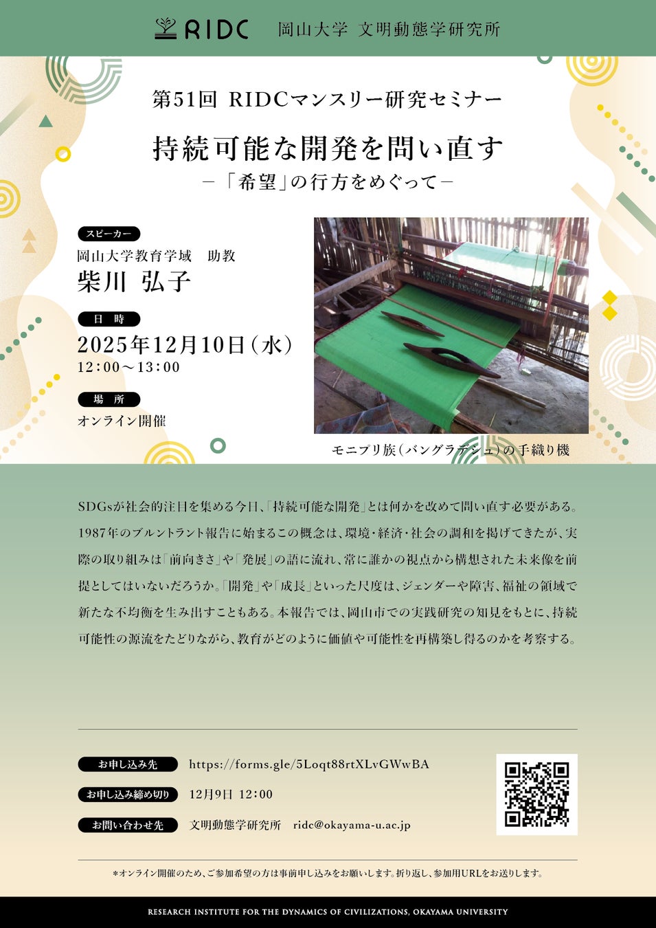 【岡山大学】高等先鋭研究院 文明動態学研究所 第51回RIDCマンスリー研究セミナー「持続可能な開発を問い直す-「希望」の行方をめぐって-」〔12/10,水 オンライン開催〕