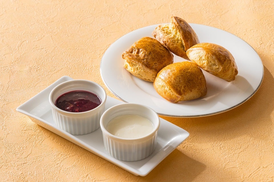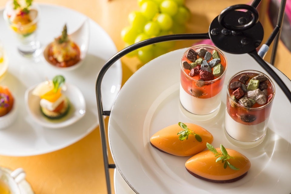 セイボリーにも季節の美味しさを取り入れ、桃とクリームチーズのカプレーゼ風ピンチョス、スモークサーモンとキュウリをくるりと巻き、グレープフルーツを添えたさっぱりとした味わいのルーロー、パッションフルーツソースを合わせたイタヤ貝のサラダ仕立てなど、食材の組み合わせにこだわったメニューで、夏らしい彩りと味わいを演出します。