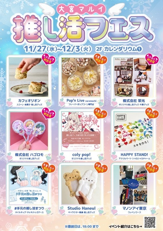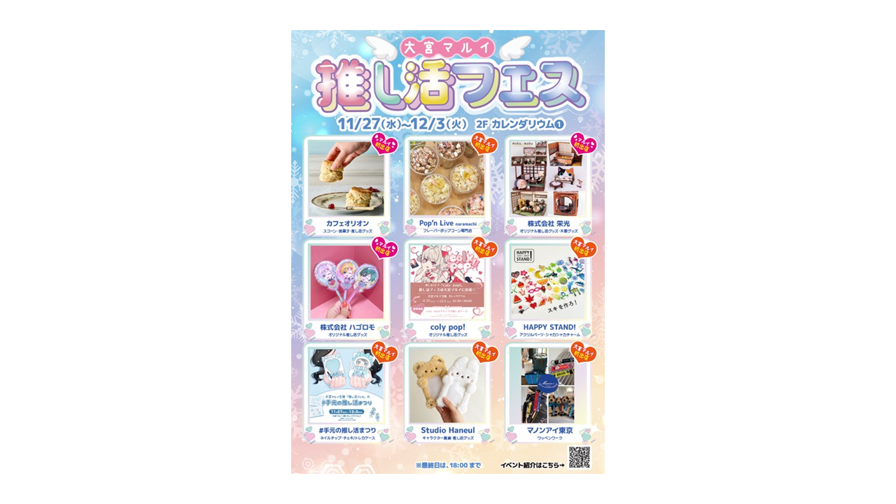 手持ちの推し活グッズをつける・飾れるアイテムや、オリジナルグッズがつくれるショップなど、あなたの推し活がさらに充実するショップが多数展開。すべてのショップが大宮マルイ初出店となりますので必見です。お手元の推し活グッズと一緒にご来店をお待ちしております。