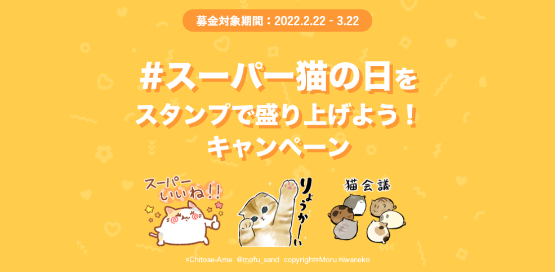 LINE株式会社(本社:東京都新宿区、代表取締役社長:出澤 剛)は、LINEスタンプを制作・販売できるプラットフォーム「LINE Creators Market」https://creator.line.meにおいて、スタンプの購入が猫の保護・支援に繋がる特別企画「#スーパー猫の日」を、2022年2月22日の「猫の日」より開催いたします。
