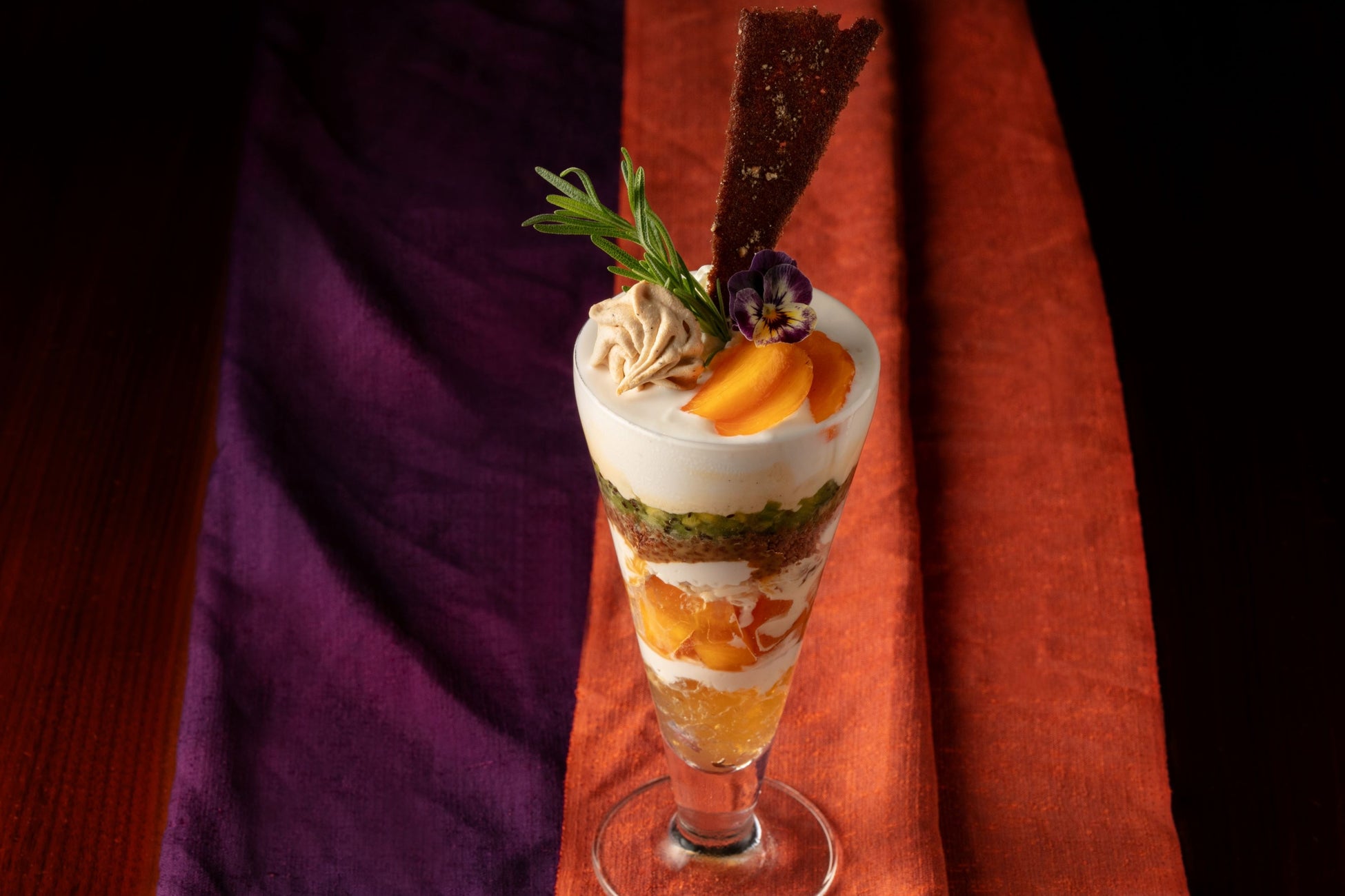 秋が深まり、冬の訪れを感じる時期にぴったりの、旬の味覚「柿」とまろやかな「チーズ」を堪能できるパフェ『Kaki-染め』は、その名の通り深い柿色に染まった秋らしい色彩と味わいの一品です。
