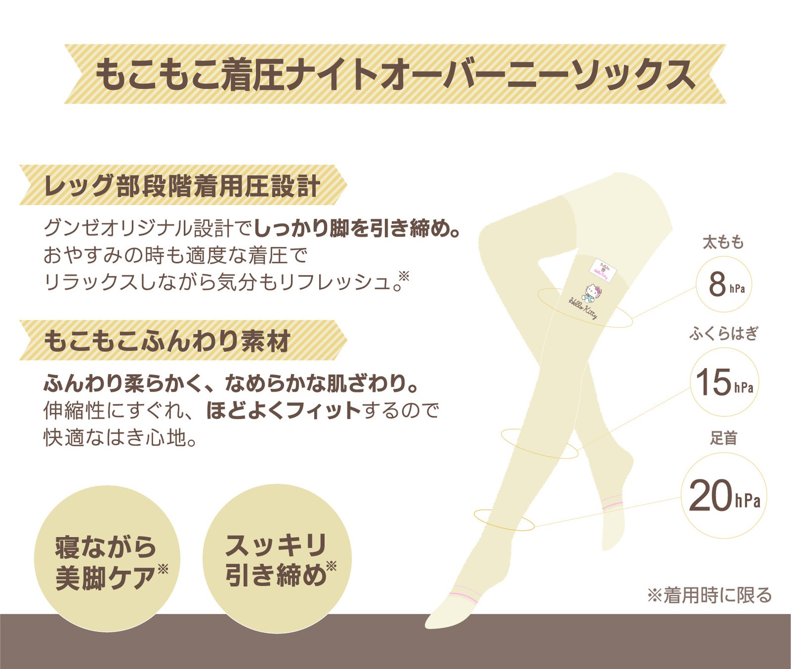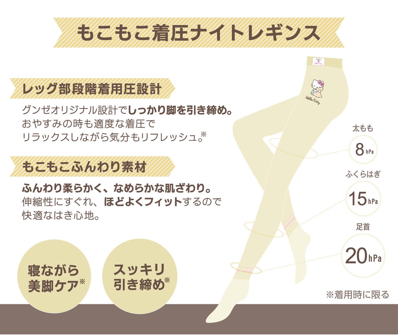 グンゼオリジナルのレッグ部段階着用圧設計で、おやすみの時も適度な着圧でしっかり脚を引き締めてくれるもこもこふんわり素材の着圧レギンス。