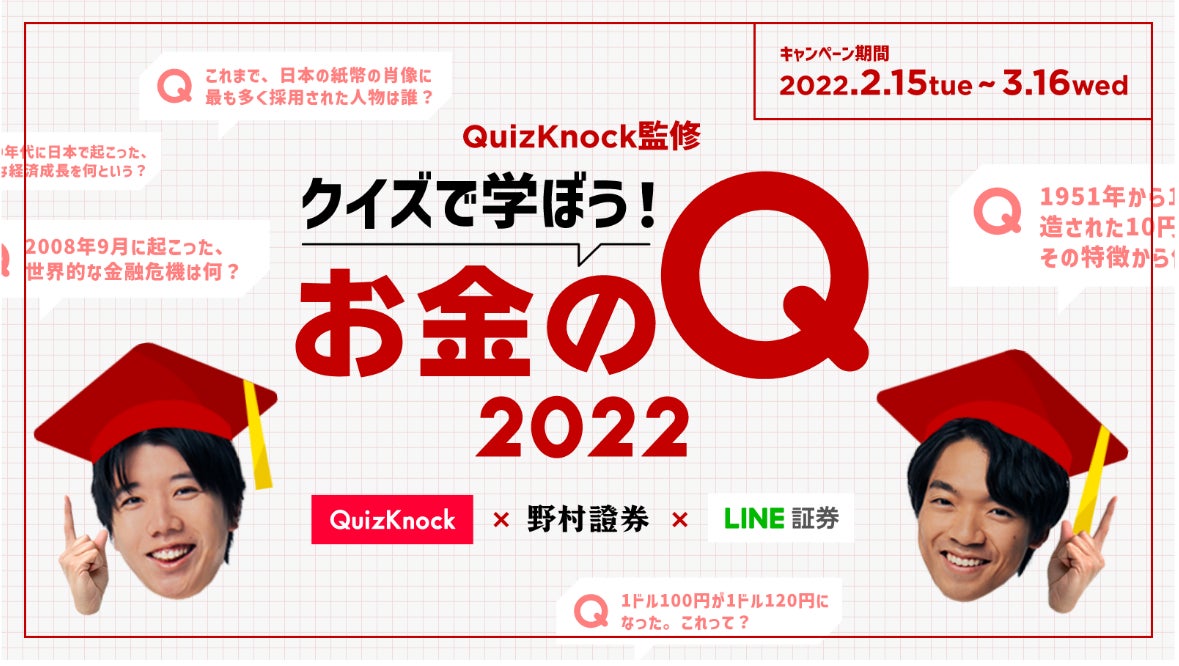 LINE証券株式会社(代表取締役Co-CEO:正木美雪・米永吉和、以下「LINE証券」)は、野村證券株式会社(代表取締役社長:奥田健太郎、以下「野村證券」)と共同で、2022年2月15日(火)より、楽しみながらお金の知識が身につくキャンペーン「QuizKnock監修 クイズで学ぼう!お金のQ 2022」(以下「本キャンペーン」)を開催します。