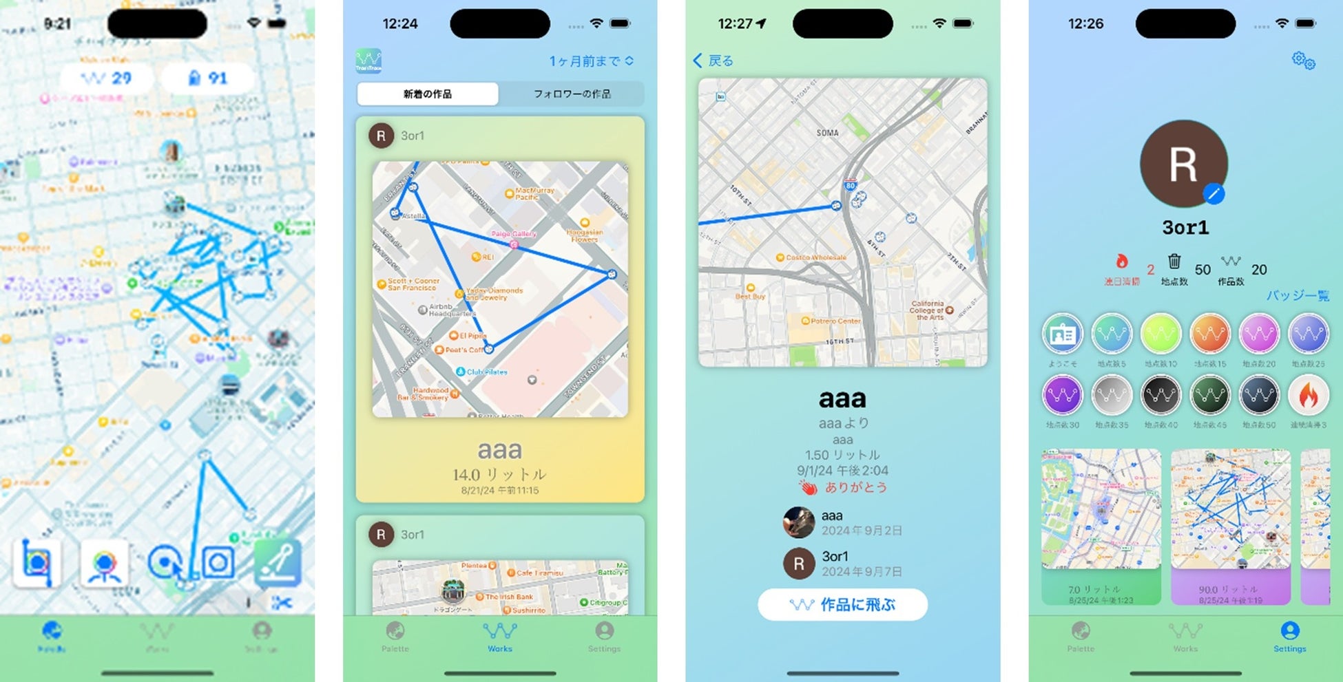 『TrashTrace』は街を自発的に清掃する人向けのSNSアプリ。清掃者は清掃した場所でごみの写真を撮ることで、地図上に点を打ち、消えない線を描いていくことができます。それを地上絵として投稿し、清掃者間でありがとうを送りあったり、作品をつくることでミッション達成バッジを得たりすることができ、清掃を続けたいと思える手助けをします。