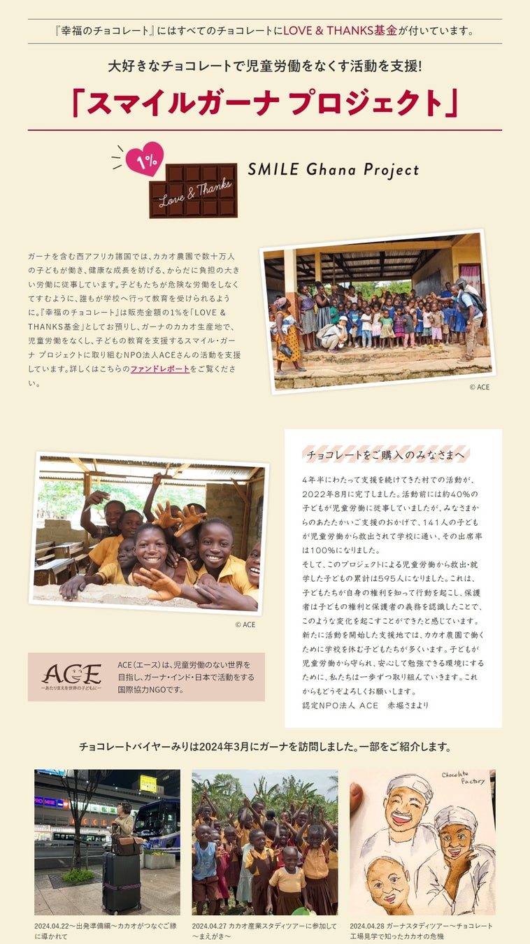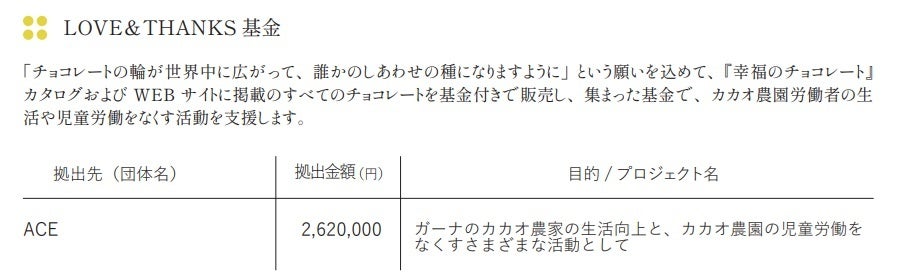 「チョコレートを愛する人の輪が世界中に広がって、チョコレートに関わるすべての人のしあわせの種になりますように」という願いを込めて、『フェリシモ・幸福のチョコレート』が販売するすべてのチョコレートには、約1%の「LOVE &THANKS(ラブ&サンクス)基金」が付いています。集まった基金は、カカオ農家の生活向上や、カカオ農園の児童労働をなくす活動に役立てられています。カカオを生産してくれる人のしあわせと豊かさなくして、持続可能なチョコレート文化はこの先ないかも知れません。チョコの未来は、チョコを食べる人のひとりひとりの思いと選択にかかっています。2010年の支援開始から2023年10月までの拠出総額は31,596,782円となりました。その内、2023年度のプロジェクトパートナーである認定NPO法人ACEの活動「スマイル・ガーナ プロジェクト」への拠出額は2,620,000円でした。
