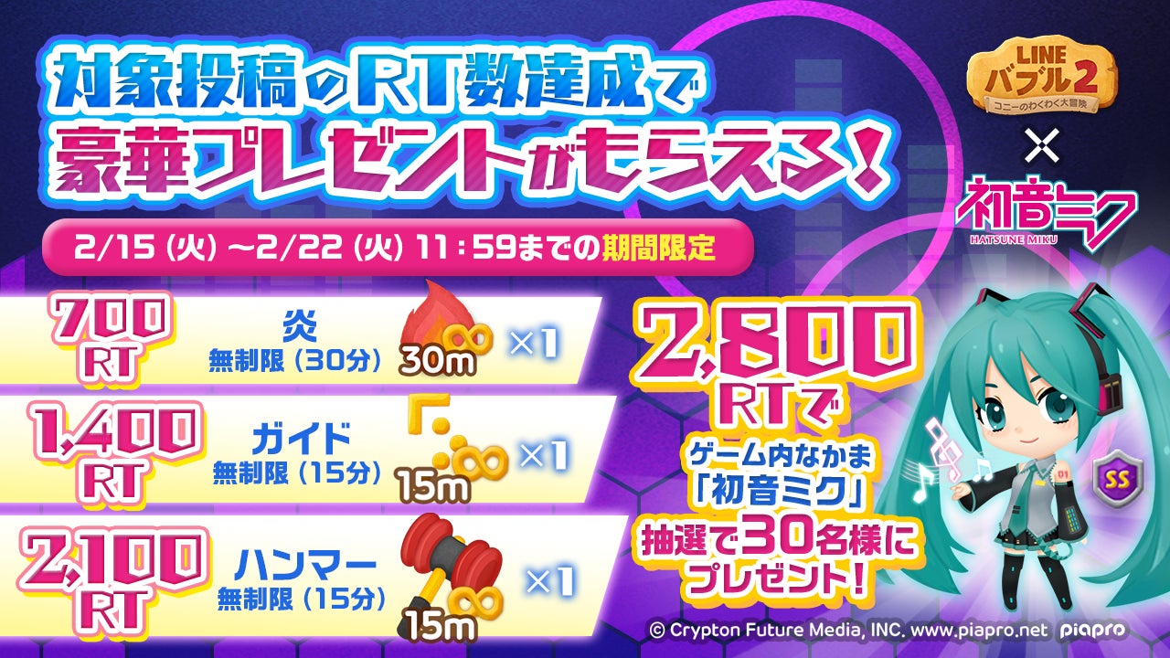 公式Twitter(@LINE_BUBBLE2_JP)の該当の投稿のリツイート数に応じてもれなく全員にゲーム内アイテムをプレゼントします。さらに、リツイート数が2,800件達成で「初音ミク(SS)」を抽選で30名様にプレゼントします。