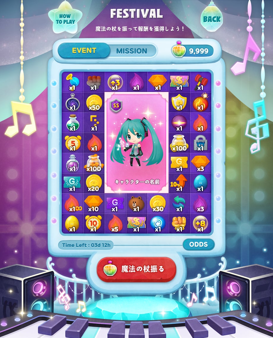 指定のミッションを達成するとマジックパウダーを手に入れることができます。マジックパウダーを使用すると報酬盤 の中からランダムで「初音ミク(SS)」やゲーム内アイテムを獲得できます。
