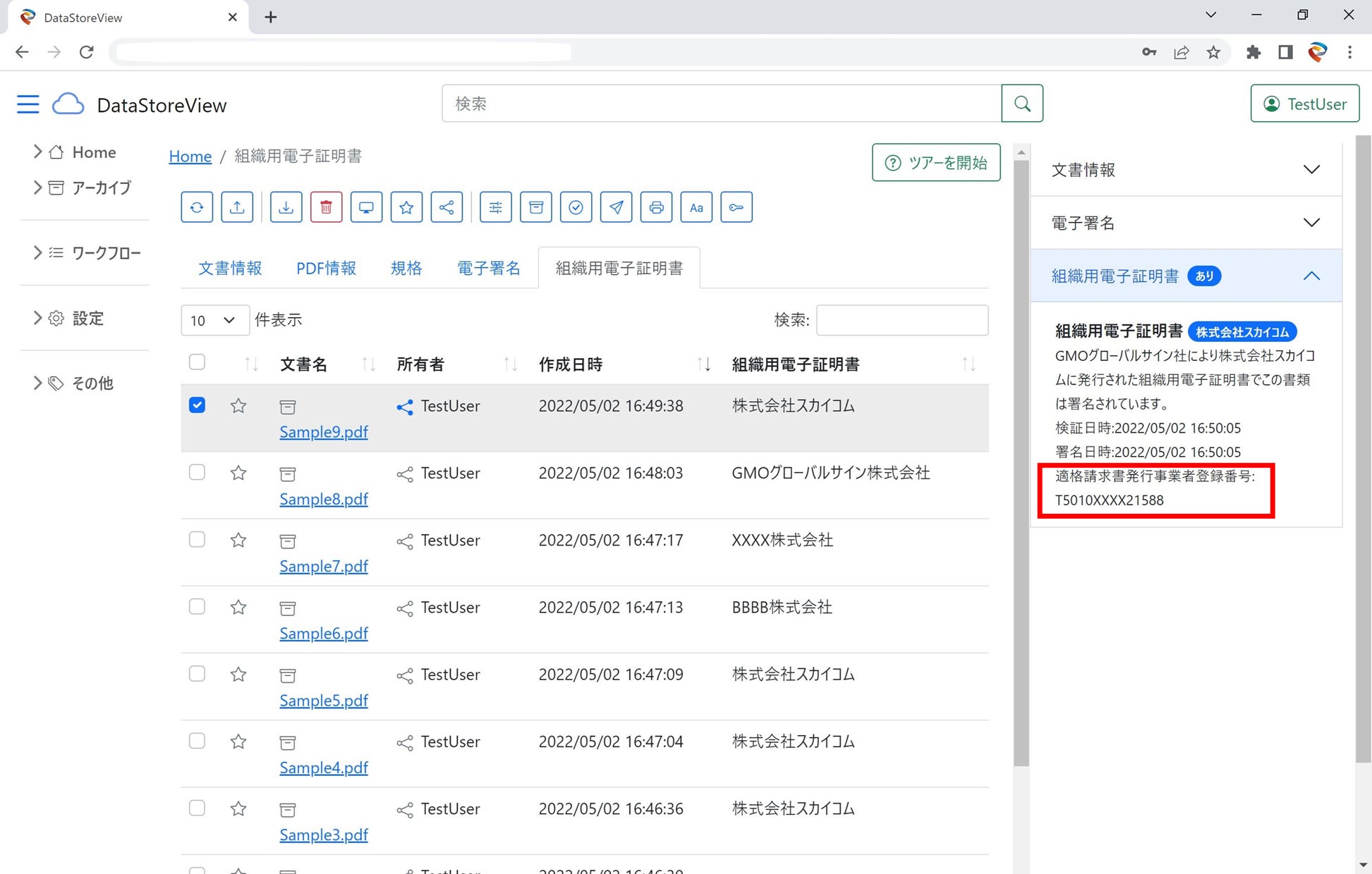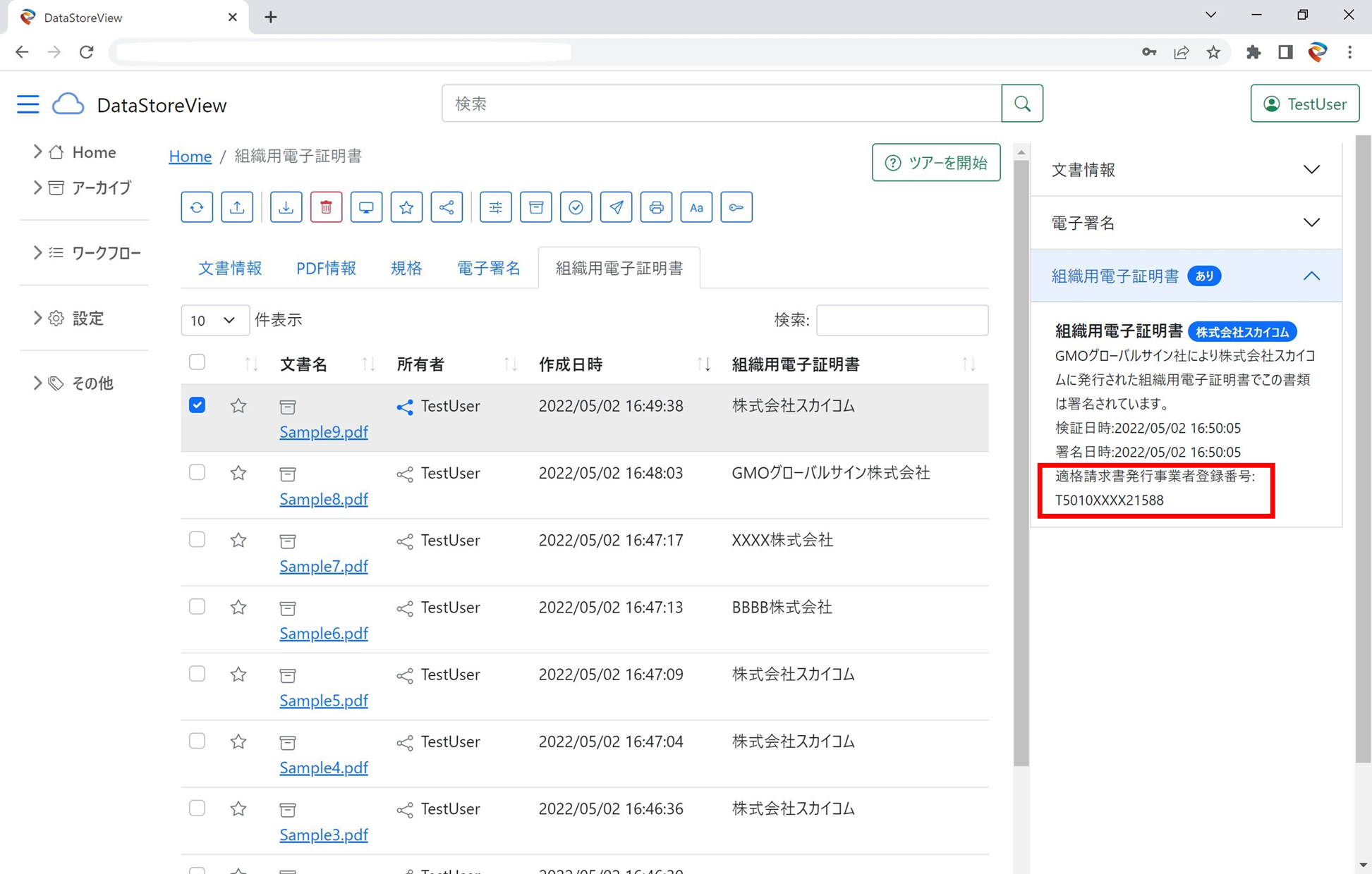 連携済みの「SkyPDF」上では、ファイルの閲覧などが可能となっているのに加え、昨年10月より登録開始された適格請求書発行事業者登録番号の表示項目も設けているため、容易に適格請求書発行事業者登録番号の確認が可能です。