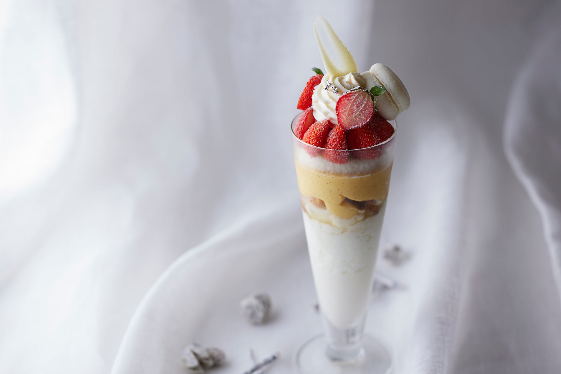 下層には、なめらかなココナツのパンナコッタとミルクゼリーに、ミルクアイスを重ねました。サクサクのサブレとホワイトチョコレートのパールクラッカンを忍ばせ、食感のアクセントと共にお楽しみください。中層は、濃厚な甘みのカスタードクリームにホワイトスポンジを乗せ、ケーキのように仕立てました。トップには、美しい色合いのコントラストが映える鮮やかな国産いちごをたっぷりと敷き詰め、真っ白なシャンティークリームを絞りました。仕上げに飾り付けたバニラのマカロンが、大人な世界観ながらも可愛らしさを演出します。