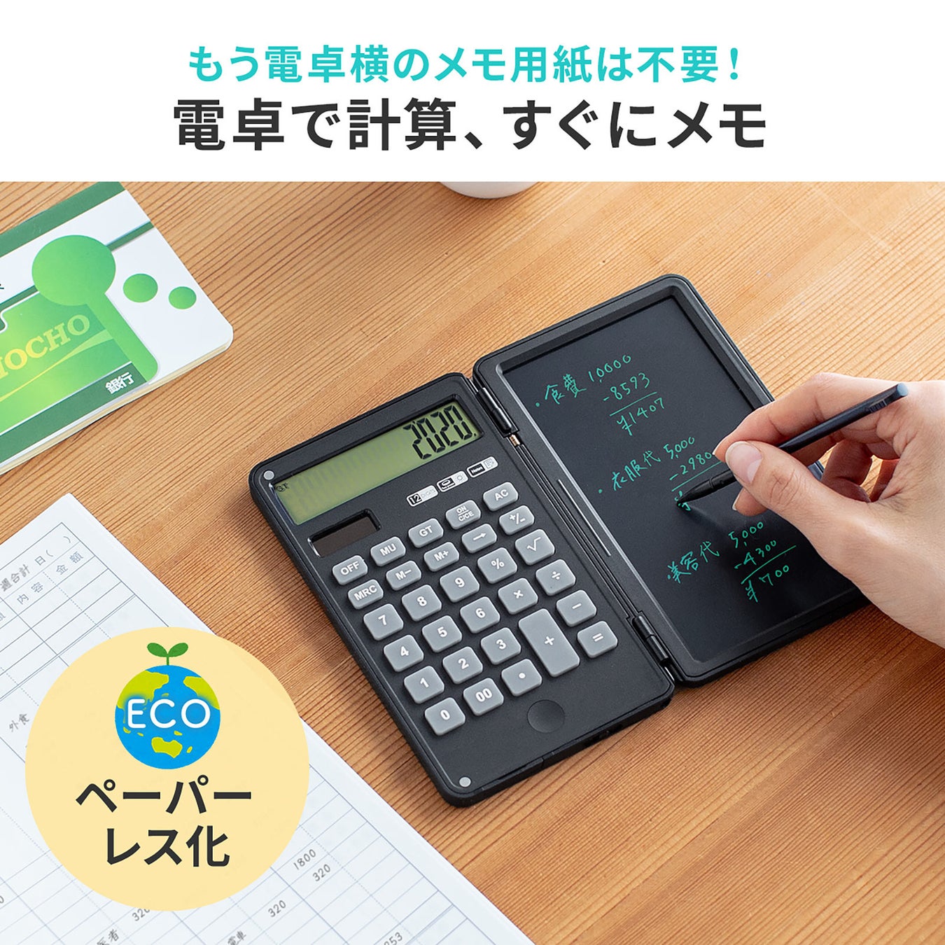 本製品は、電卓と電子メモパッドが付いた電卓付きメモパッドです。