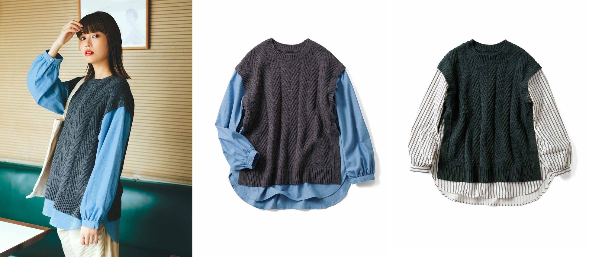 重ね着に見せつつ、実は一枚な技ありチュニックです。季節感たっぷりのニットベストに、シャツの袖とすそだけをドッキングしているので、見た目の印象より着心地は軽やか。秋の気分をいち早く、でも着心地は暑苦しくない一枚です。2種類のカラーから選べます。