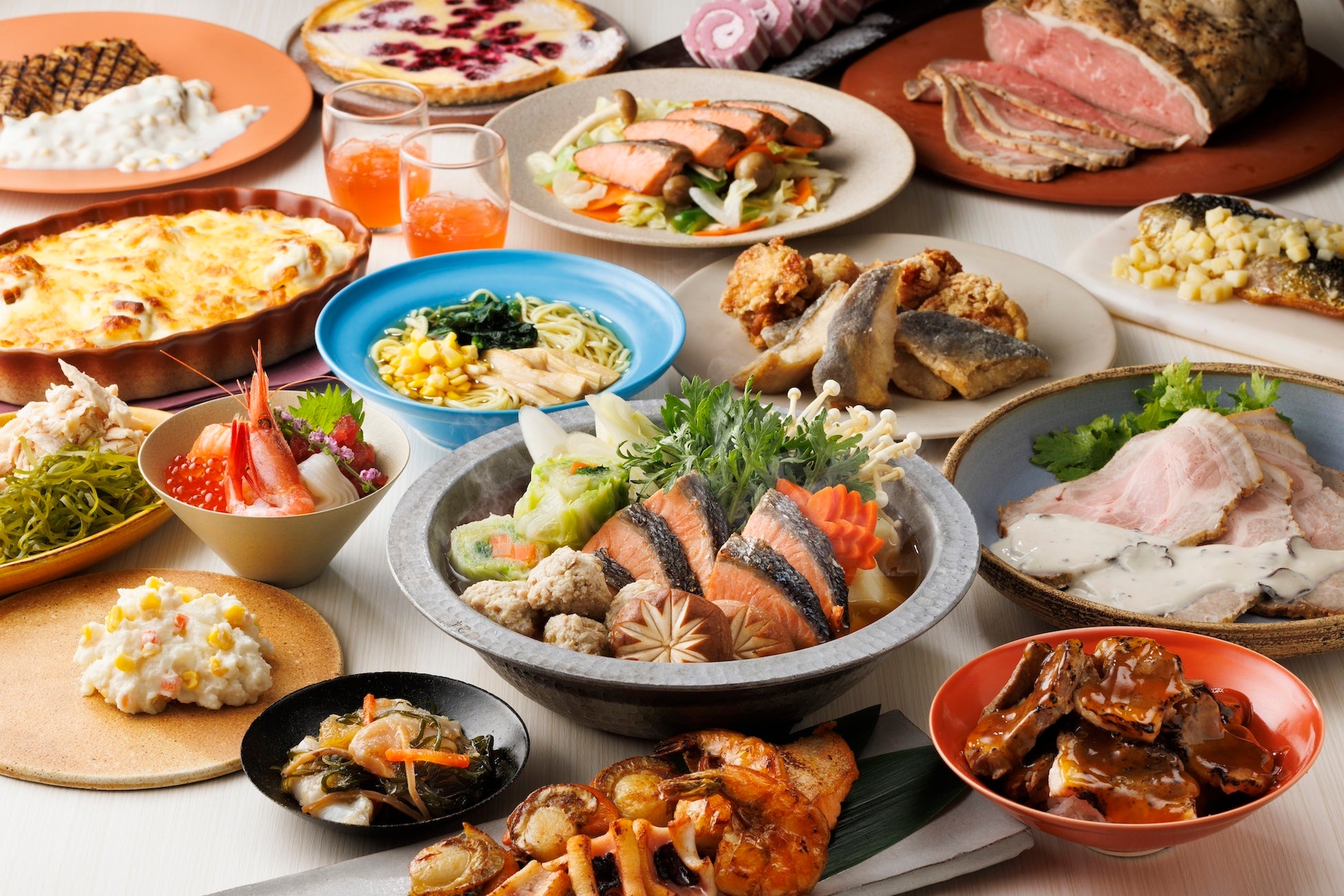 北海道産秋鮭のちゃんちゃん焼き風/カスベのオーブン焼き 日高昆布風味のバターソース/鰊のポワレ ポテトのオイルソース/真ホッケの唐揚げ&鶏ザンギ/北海道産帆立貝のマカロニグラタン/北海道産桜姫鶏もも肉のグリエ 北海道豆乳のコーンチャウダーソース/北海道産麦小町豚肩肉のローストポーク 十勝マッシュの香るヴァンブランソース/北海道鮭フレークのペペロンチーノ/石狩鍋/丼コーナー(海鮮丼・豚丼)/ラーメンコーナー(旭川の醤油・札幌の味噌・函館の塩)