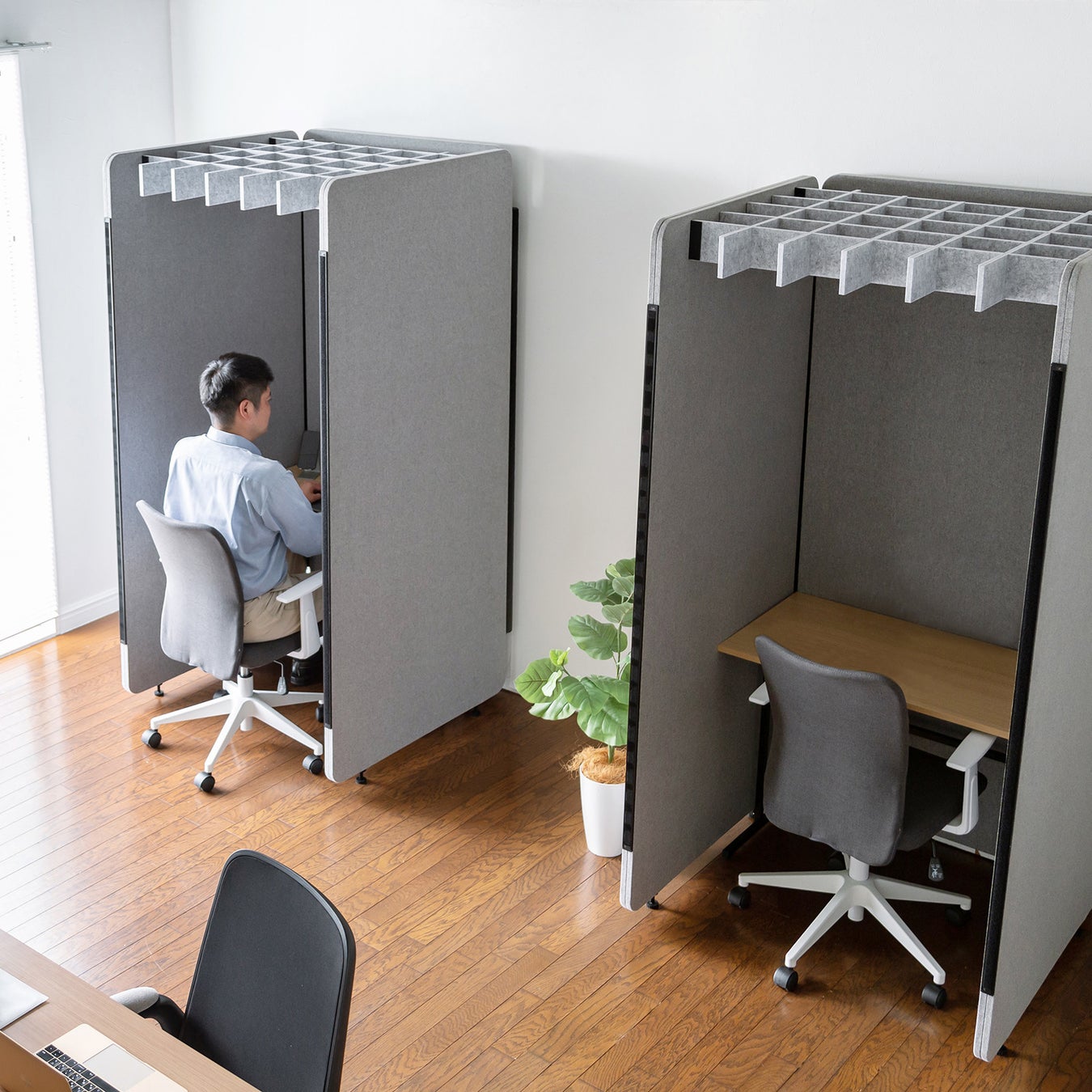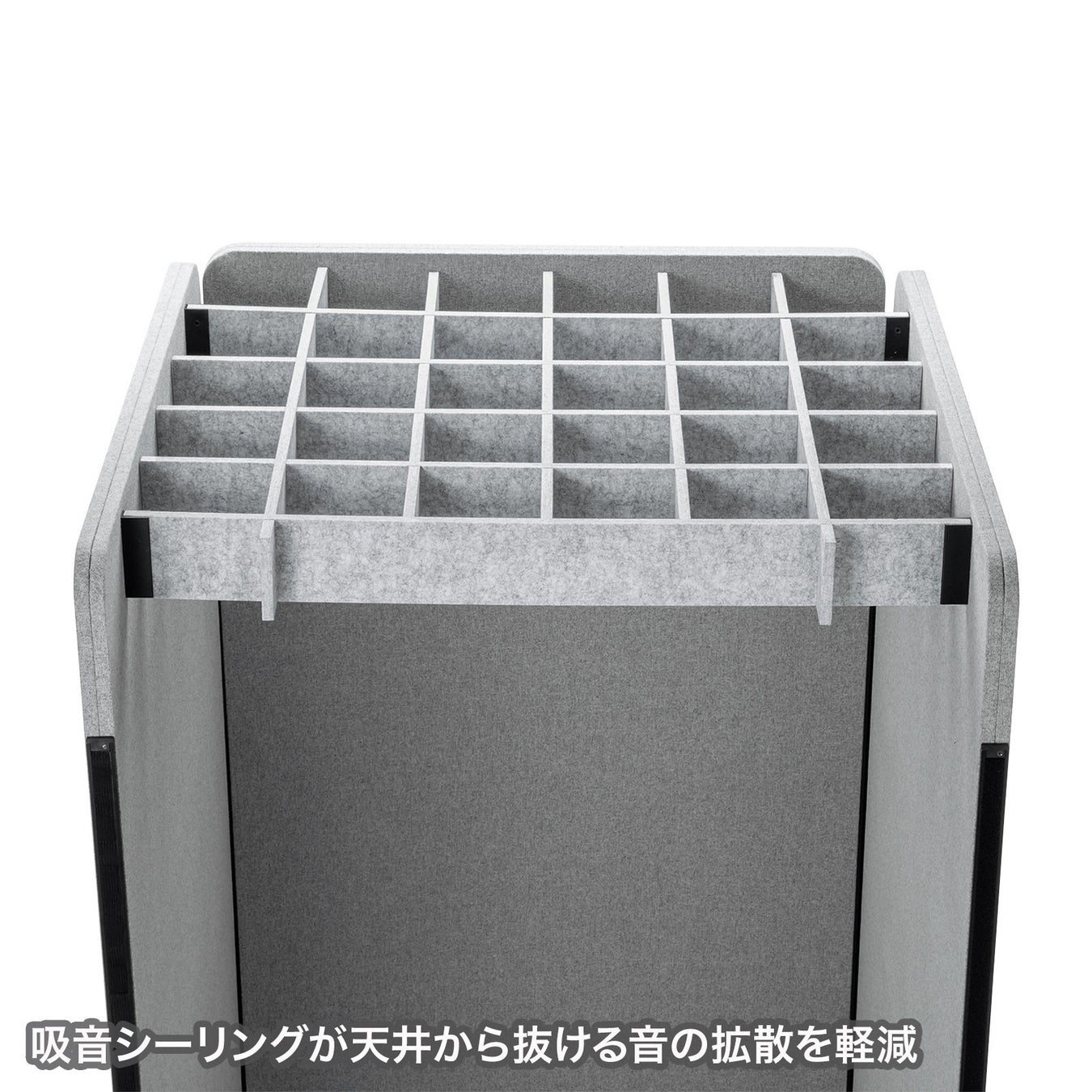 厚さ32mmのフェルトパネルを採用しており、気になる反射音や周囲の音をしっかり吸音します。天井部にも吸音シーリングを備えており、外部への音漏れを軽減するため、WEB会議での使用や集中できる1人用ブースとして最適です。