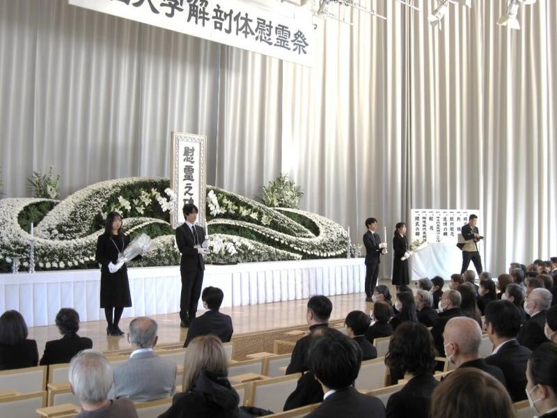 今年度は、ご遺族や本学教職員、学生約440人が会場に参列しました。参列者は、祭壇に献花し、昨年9月1日から今年8月31日までに本学の解剖教育および病理解剖にご貢献いただいた127人のご冥福をお祈りしました。