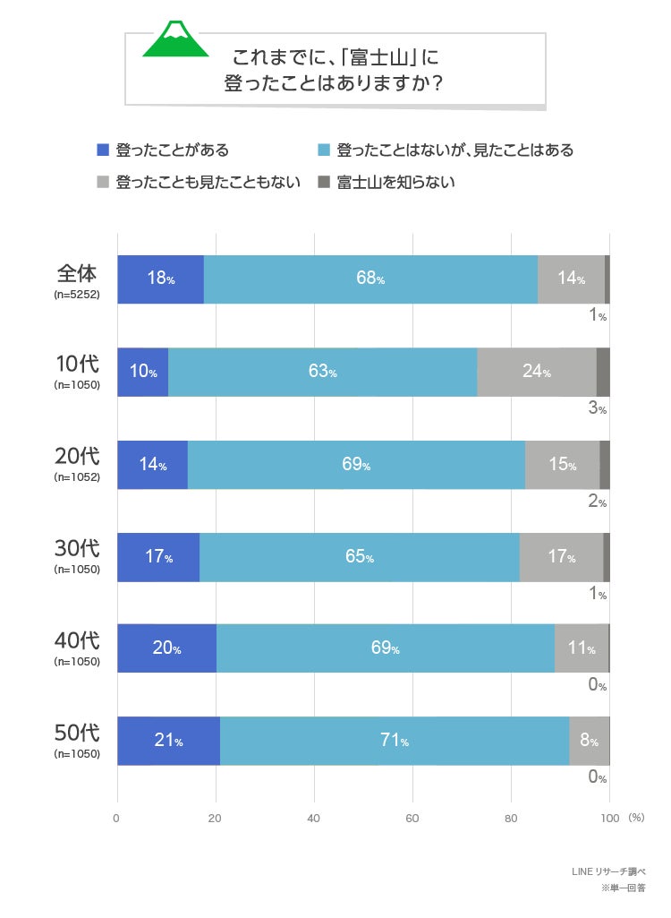 【LINEリサーチ】「富士山」に登ったことがある人は全体で2割弱、男性30代以上では2割超