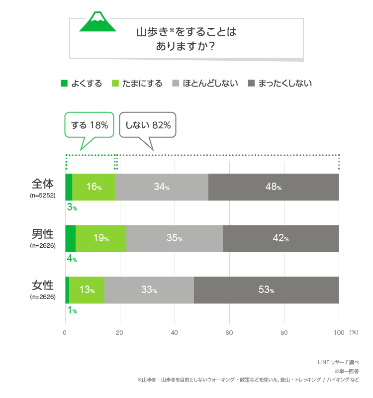 このたびLINEリサーチでは、日本全国の男女を対象に、2月23日の富士山の日にちなんで、ふだん山歩きをする人の割合や富士山に登ったことがある人の割合について調査しましたので、その結果をお知らせいたします。