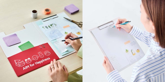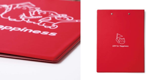表にはチャリティーのキービジュアルが大きくプリントされています。クリップ付きで、紙をはさんだり、内側のポケットにノートや文房具を入れたりなど使い方はいろいろ。