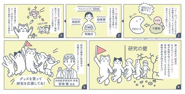 私たちは、タンパク質の「AIM」に注目し、腎臓病をはじめこれまで治らなかった多くの病気の治療法の研究開発に取り組んでいます。2022年4月には、一般社団法人AIM医学研究所(略称IAM)を設立。愛猫家さんの切なる願いにこたえるため、先行して猫用のAIM医薬の完成へと歩みを進めています。近い将来、猫でも人でも今まで治らなかった病気をひとつでも多く治すことができるよう、努力を続けてまいります。どうぞ応援、よろしくお願いいたします。