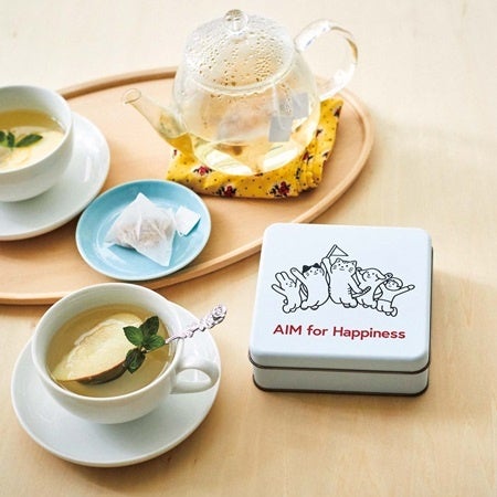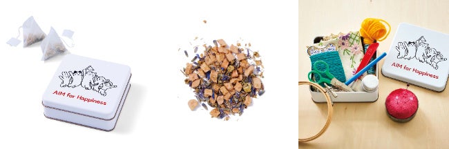 フルーティーな味わいのハーブティーが楽しめる缶入りのお茶です。りんごの風味と、カモミールとラベンダーのやさしい香りに癒されます。缶の表には、チャリティーのキービジュアルがプリントされていて、飲み終わったあとも小物入れとして使えます。