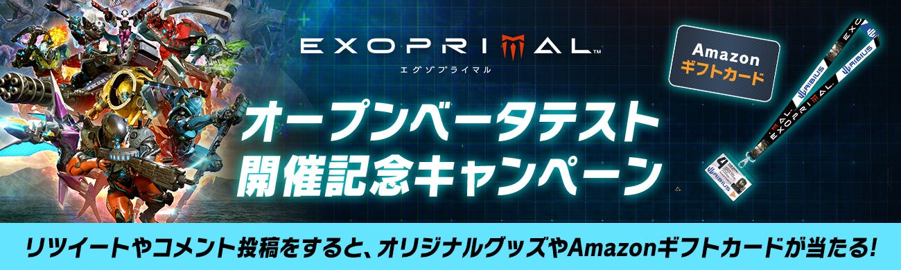 話題のオンライン専用チーム対戦型マッシヴアクション『エグゾプライマル』のオープンベータテストの開催を記念したTwitterキャンペーンがスタート! オープンベータテスト開催前と、開催中の2回のチャンスで当選確率も2倍!? リツイートもコメント投稿も、どちらも参加して豪華賞品を手に入れよう!