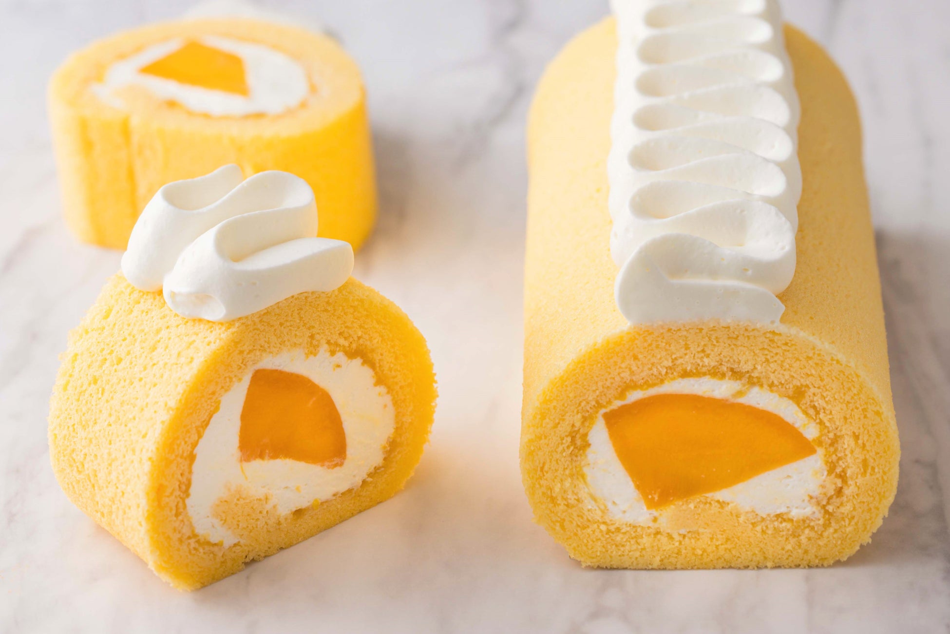 季節の移ろいとともに楽しむ、華やかなロールケーキ。旬のフルーツの香りや甘みを引き立てるため、果実ごとに自家製のコンフィチュールを仕立てて使用。果実の味わいを際立たせるためのひと工夫が、ホテルメイドならではの上質な仕上がりを生み出しています。スポンジには米粉を用い、しっとりとなめらかな口あたりに。見た目にも涼やかな、夏限定の2種をご用意しました。