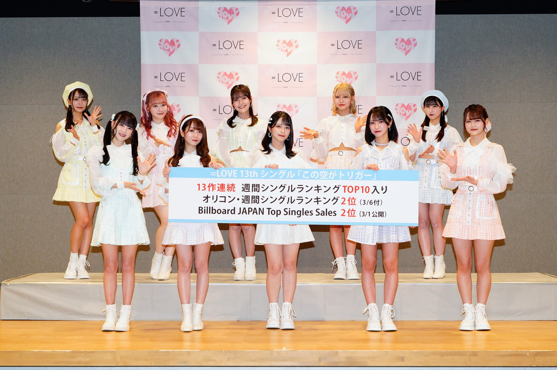 指原莉乃がプロデュースする =LOVE(イコールラブ)は、2月22日(水)に、13th シングル「この空がトリガー」を発売しました。本日2月28日(火) シングル発売を記念して『=LOVE 13th シングル「この空がトリガー」発売 記者発表会』を開催。 13th シングル「この空がトリガー」 は3/6付のオリコン・週間シングルランキング、3/1公開のBillboard JAPAN Top Singles Salesで、ともに過去最高値のポイント・集計を記録し、見事2位にランクイン。(全13作連続 週間シングルランキングTOP10入り を達成!)