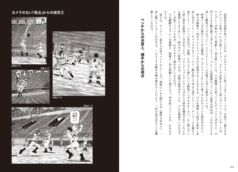 ジャンルの勃興期から20世紀までの流れを俯瞰・整理した第一章、21世紀の現在に至るまでの作品群を集積・評価した第二章、野球マンガならではの試合&プレーの表現を分析・解体した第三章、