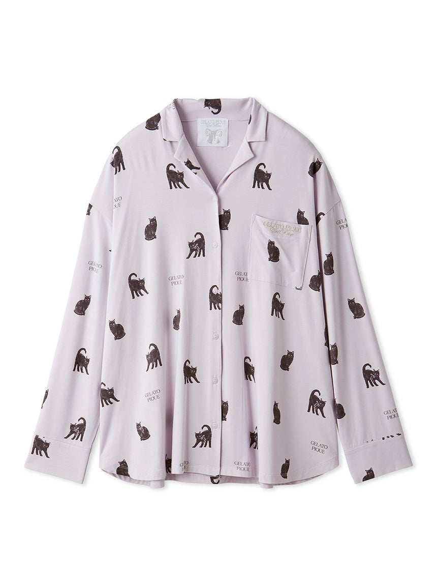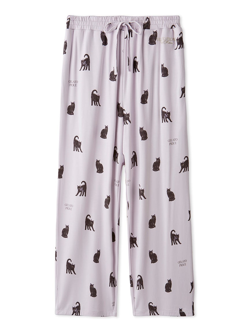 いつまでも触れていたくなるような、ややとろみのあるなめらかな肌触りのカットソー素材と、愛らしい黒猫の表情に癒されるルームウェアです。