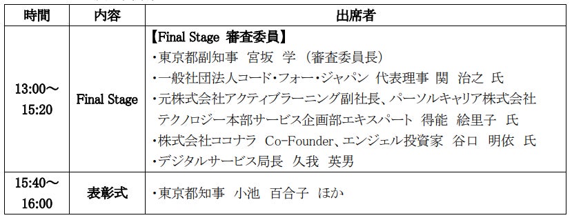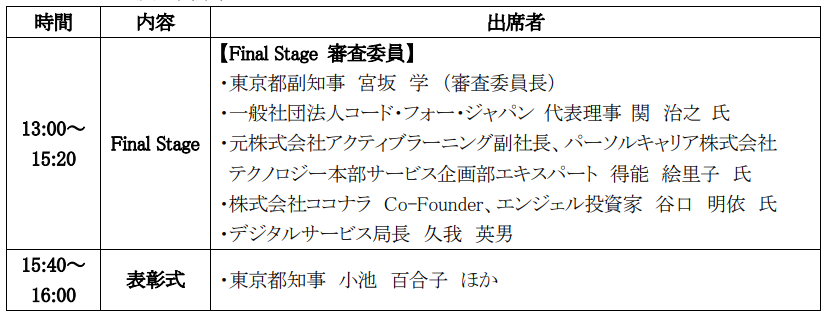 この度、First Stageを通過した10件の中から、最優秀賞である「都知事杯」を決める「Final Stage」及び知事出席による「表彰式」を下記の通り開催します。また、今年度は新たに、一般視聴者の投票により決定する「オーディエンス賞」などを新設しましたので、ぜひ奮ってご参加ください。