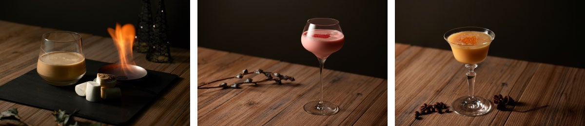 また、カカオの豊潤な香りを味わうカクテル3種『魅惑のアレキサンダー』も提供いたします。炙ったマシュマロのまろやかな味わいを幻想的な演出とともにお楽しみいただく「炎のマシュマロ・ショコラアレキサンダー」をはじめ、甘酸っぱいストロベリーでブランデーとカカオの香りを引き立てた「フリーズドライのストロベリーアレキサンダー」、エスプレッソとオレンジの豊かな香りを閉じ込めた「エスプレッソとオレンジのアレキサンダー」といった、冬の始まりに味わいたい風味豊かなカクテルを取り揃えました。