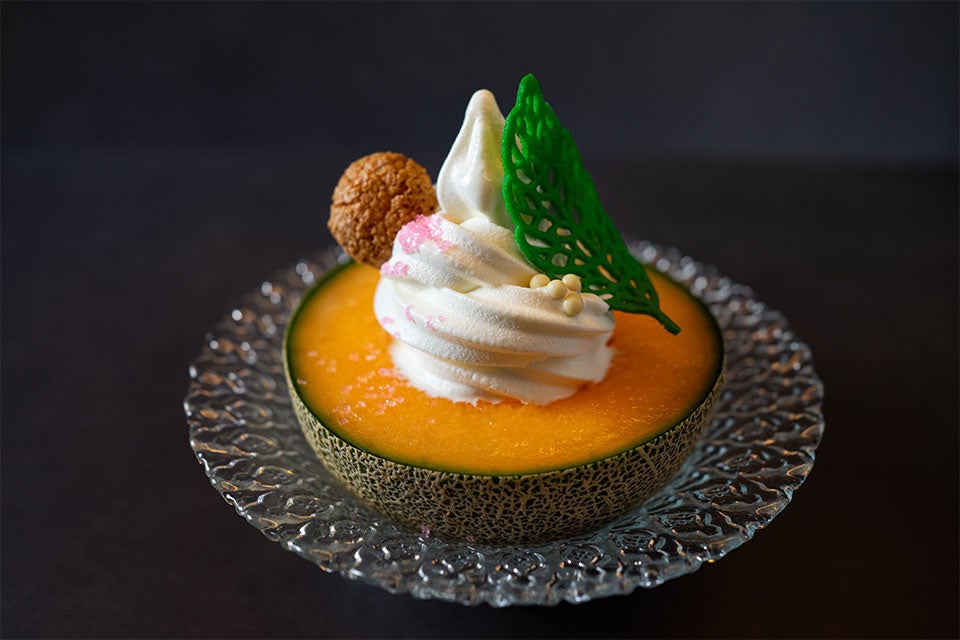 北海道産メロン半玉に、濃厚なよつ葉のソフトクリームをのせた夏限定の贅沢スイーツ。食後の締めにもぴったり。