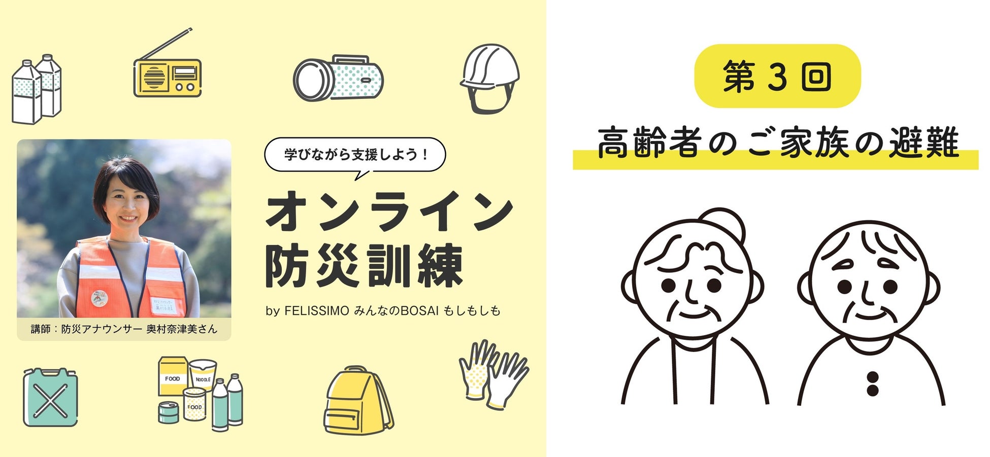 フェリシモが展開する「みんなのBOSAIプロジェクト もしもしも®」は、第3回「オンライン防災訓練」を9月21日(土)に開催します。防災アナウンサー×環境省アンバサダーで防災士の奥村奈津美さんを講師に迎え、高齢者家族と同居の方のための防災の心得をお伝えします。過去2回の参加者満足度は95%以上。自宅にいながら個々の状況に応じた防災のノウハウについて体験を交えてライブで学ぶことができ、過去の参加者からは「災害をリアルに身近に感じられる」「具体的に何をしたらいいかわかる」との声が寄せられています。フェリシモは神戸を拠点とし、1995年に発生した阪神・淡路大震災以降、防災と災害復興支援に取り組んでいます。約30年間の災害支援経験から、不安に思う災害もおこる前なら準備できることがたくさんあること、災害が起こった時の対策が長年アップデートされていないことを痛感し、備品と知識をバージョンアップできる防災を推進しています。尚、参加費500円は、「令和6年能登半島地震」をはじめとした日本各地の自然災害の復興支援に全額寄付されます。