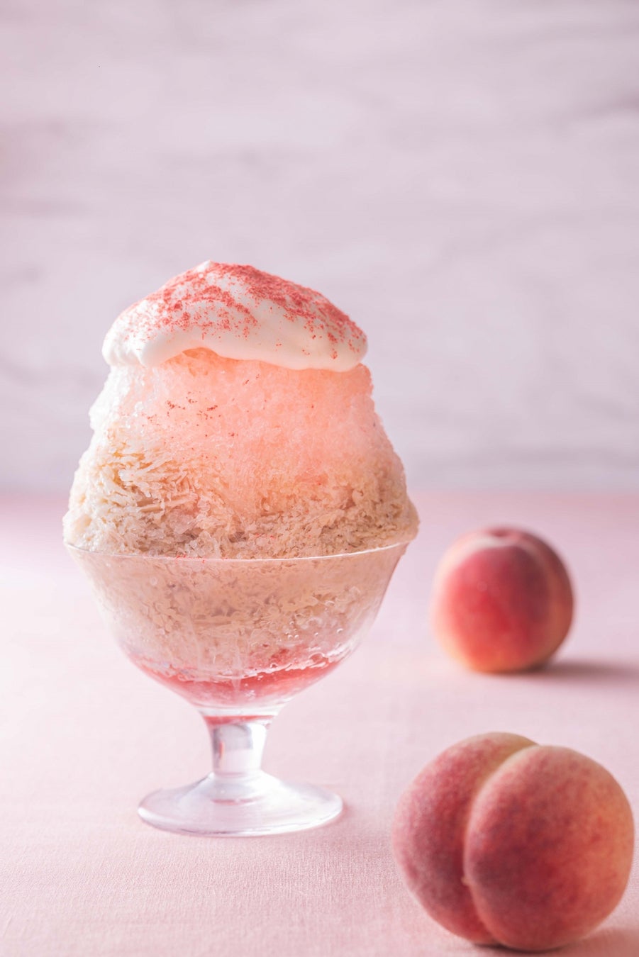 「桃」のかき氷の中には、みずみずしい桃のコンポートを1/2個分と、なめらかでコクのある杏仁豆腐を。味はもちろん、食感も絶妙なバランスで構成されます。そして最後には、ほんのり香る紅茶シロップが層をなし、口いっぱいに広がる贅沢な甘さと香りをお楽しみいただけます。夏にしか味わえない“上質なスイーツ”をお届けします。