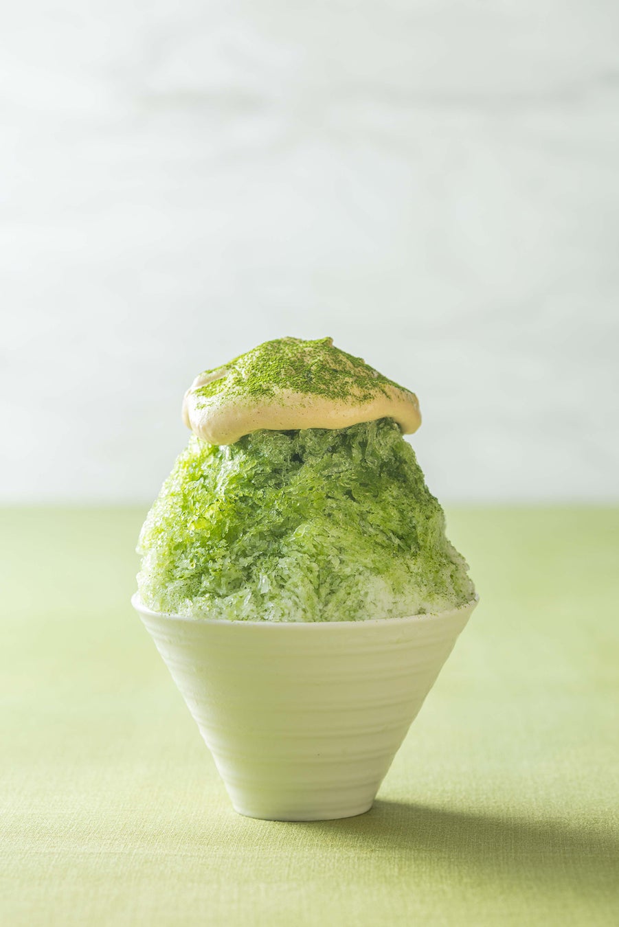 もう一品の「抹茶」のかき氷は、全国茶品評会でも高評価を得ている「愛知県西尾産の抹茶」を使用。その香り高さとほろ苦さはスイーツとの相性が抜群とされ、抹茶デザートの定番素材となっています。氷の中には、北海道産小豆のぜんざいをしのばせ、さらに下層にはミルクのシロップをかけて、抹茶との絶妙なバランスを演出。オレンジゼリーをアクセントにすることで、重くなり過ぎない爽やかな味わいが広がり、仕上げには黒蜜の泡ジュレをふんわりとトッピングしました。