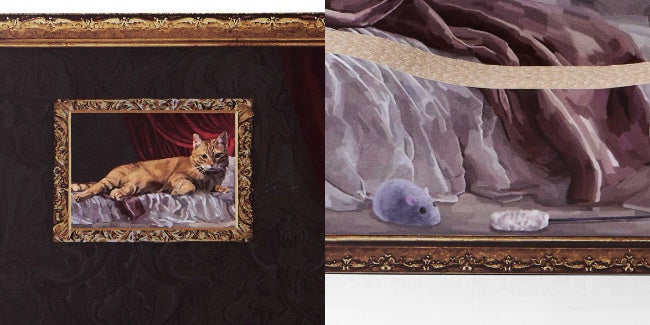 名画風のデザインの中には、猫用アイテムならではのこだわりポイントも。背景には、使用シーンと同じ構図でくつろぐ高貴な雰囲気の茶トラ猫の「画中画」が飾られています。床には、ネズミのおもちゃやボールなど、猫用おもちゃが乱雑に散らばっていて、猫が遊び疲れて寝てしまったようなシーンをイメージしたデザインになっています。