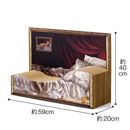 ベッドを模したつめとぎ台部分は、猫がゆったり寝転がれる幅に設計。天幕と壁紙のアラベスク文様がゴージャスな背景部分も、積層ダンボール製でしっかり厚みと硬さがあります。