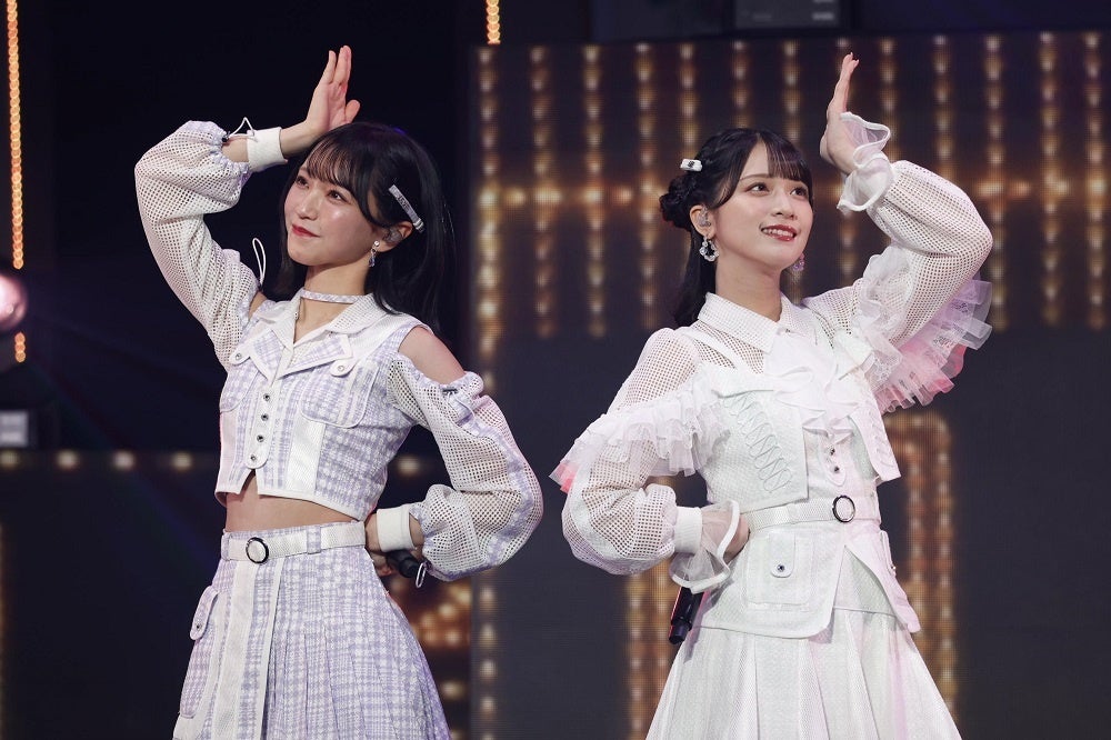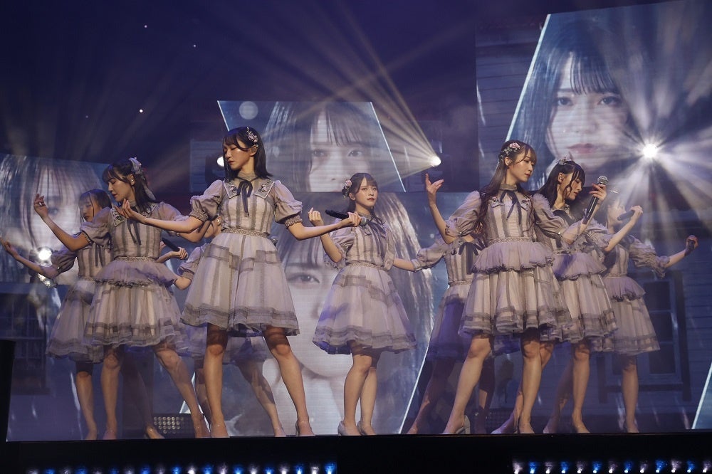 その後はユニット曲、ソロ曲のパフォーマンスが続く。佐々木舞香・野口衣織・諸橋沙夏による″本気の愛を願いながらも、曖昧な関係から抜け出せない、複雑な心境を描いた大人の恋愛ソング『知らんけど』、会場をペンライト青色一色に染め上げた髙松瞳のソロ曲『僕のヒロイン』、佐々木舞香のソロ曲『真夜中マーメイド』とユニット、ソロ曲ならではのパフォーマンスでオリジナリティー溢れるパフォーマンスで魅了。
