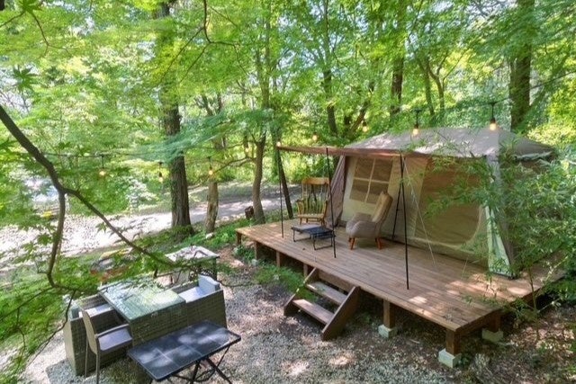 東大和市の狭山丘陵の中にある、手ぶらで日帰りアウトドアの体験が楽しめる施設です。大型テントサイト・60 年以上続く老舗料亭が提供する厳選食材BBQ・焚火を新緑の森の中でお楽しみいただけます。