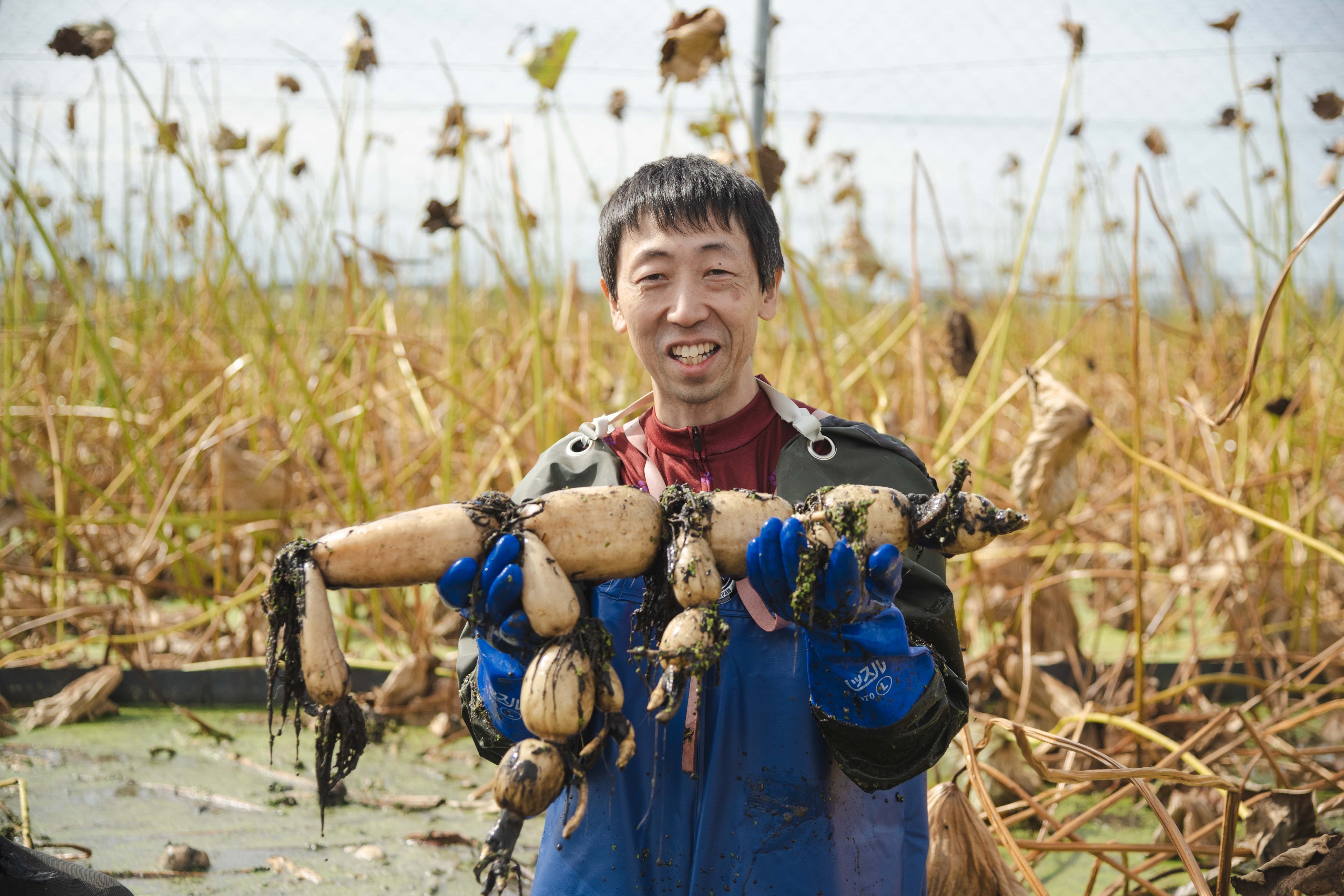 日本一のれんこんの産地土浦でれんこんづくりを続ける市川蓮根3代目代表を務める若き35歳。土浦市の「日本一のれんこんグランプリ」で2022年、2023年と2年連続で最優秀賞を受賞のほか、これまで数々の賞を受賞。土作りからこだわり、朝採れした新鮮なれんこんを選別から出荷まで真心込めて行っている。最近はテレビ番組にも出演し、都内のミシュラン選定のレストランでも採用されるなど知名度も上がっている若きれんこん農家です。