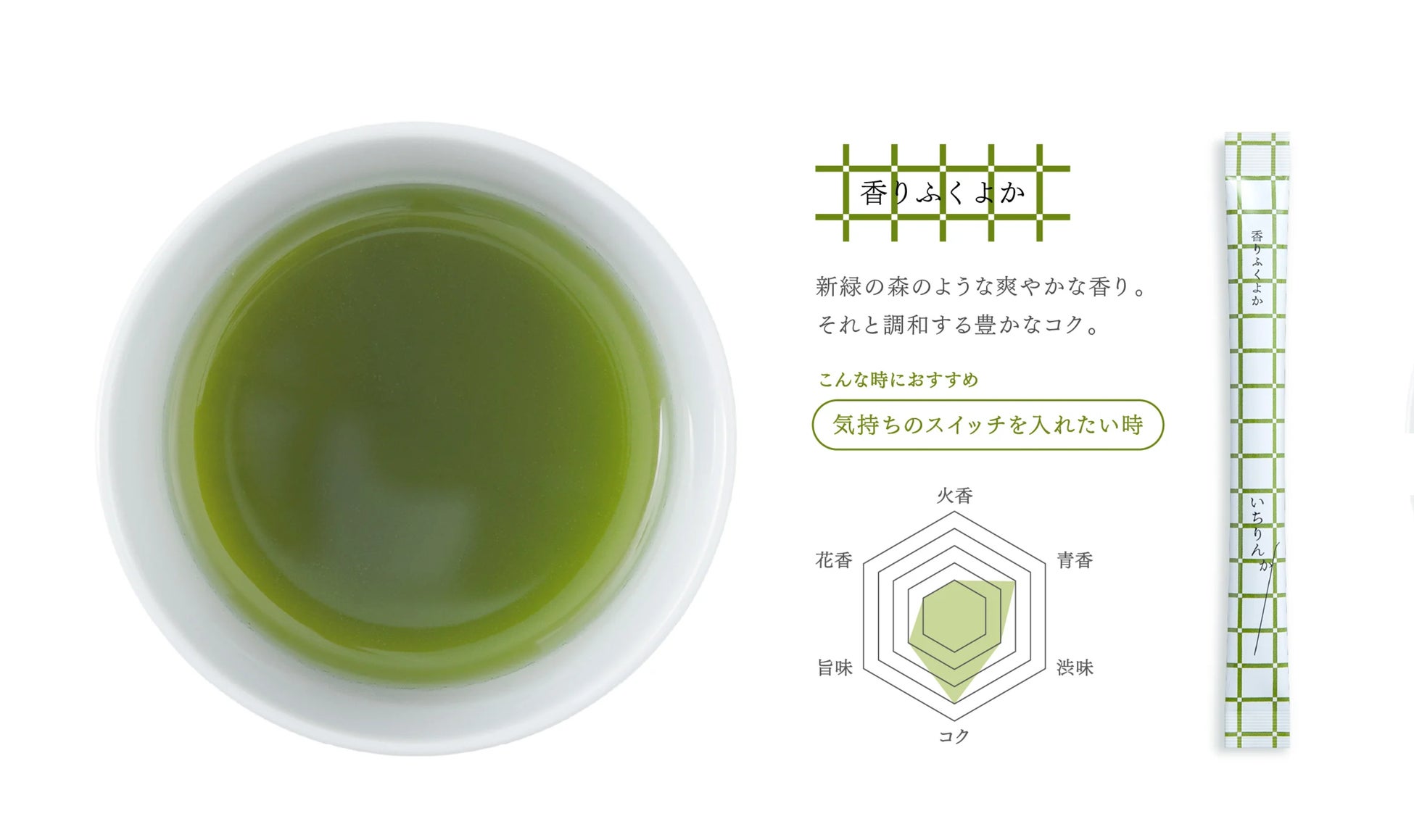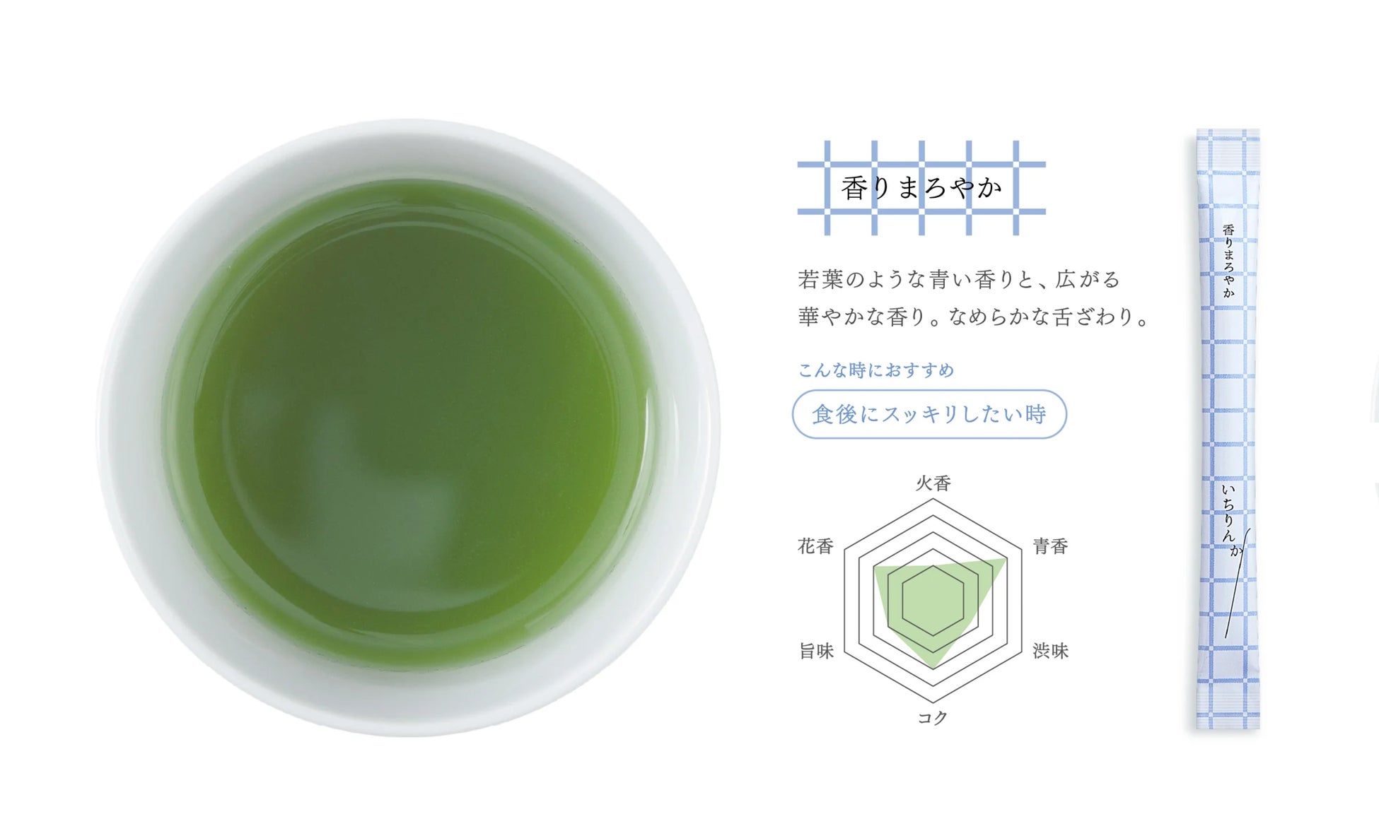 なにげなく生けられた一輪の花のように、一杯のお茶で心に潤いと、ときめきをもたらしたい。すっと伸びたパウダースティックを、香り高い一輪の花に見立て『いちりんか』と名付けました。