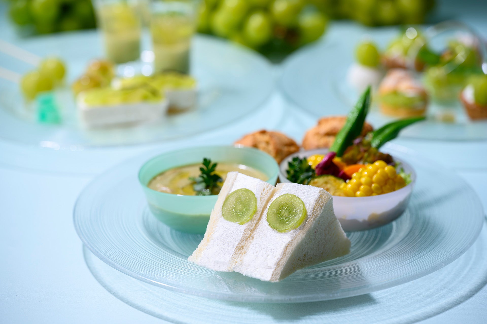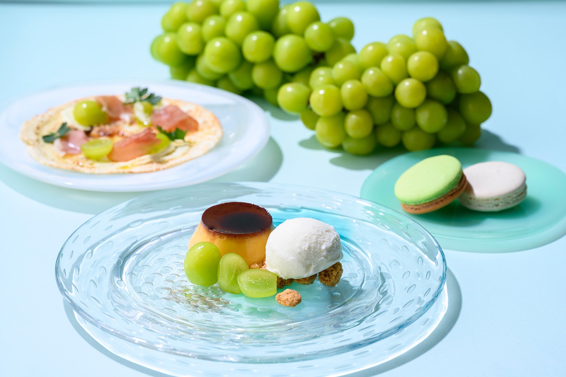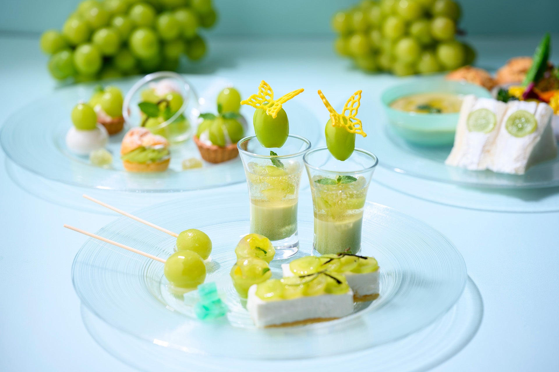 スタンドの上段、中段には、シャインマスカットを使用したスイーツが並びます。さっぱりとしたシャインマスカットのジュレをバニラの甘く柔らかなコクで包み込み、抹茶のほろ苦さで後味を引き締めたグラスパフェ仕立てのパンナコッタや、シャインマスカットの爽やかな酸味とバニラの濃厚でまろやかな甘さが調和したシュークリームなど、香りと味わいのハーモニーをお楽しみいただける内容です。