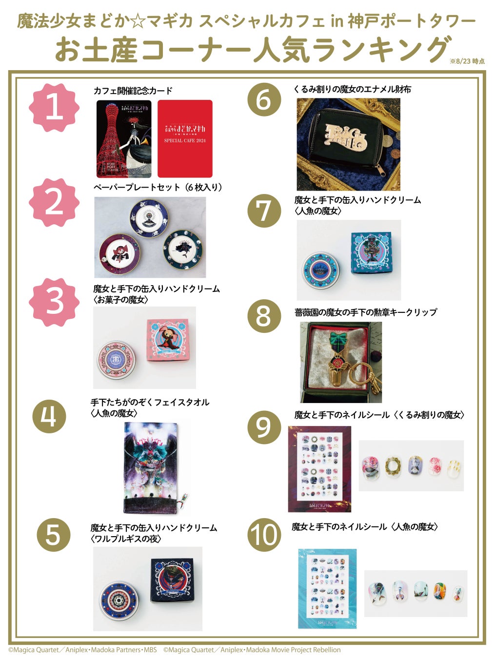 展望3階「Ready go round」開催スペシャルカフェの専用席は、9月23日までの期間中予約可能な席がございますのでぜひご予約ください。国内では希少になりつつある回転するフロアでのスペシャルカフェというのはなかなか珍しいのではないかと思います。スタートして間もないですが、幅広いご年齢層のお客さまにお越しいただいており、やや女性が多めで若い方が若干多い印象です。男性おひとりで来場される方もいらっしゃいます。遠方からのお客さまも多くおられて、中には1日3回、朝、昼、夜と事前予約をして来場されメニューを変えて楽しまれる方もいらっしゃいました。グッズも数多くお買い求めいただいています。有料エリア展望3階のメニューでは「魔女たちのプリンパフェ&スペシャルドリンクセット〈くるみ割りの魔女セット〉」が人気です。一番の数が出ているメニューは、低層1階無料エリア「Ready go round mini[レディーゴー ラウンド ミニ]」の「くるみ割りの魔女のソフトクリーム」です。X(旧Twitter)の投稿から、海外からお越しいただくファンの方もいらっしゃいます。2023年、フェリシモの都市型ワイナリー「fwinery」で『魔法少女まどか☆マギカ』スペシャルカフェ in KOBE< https://prtimes.jp/main/html/rd/p/000003177.000012759.html >を開催した際にも海外からのお客さまがいらしていたことを思い出します。スペシャルカフェが神戸ポートタワーへ来場いただくきっかけとなり、たくさんの体験を持ち帰っていただくことができれば幸いです。(「神戸ポートタワー」スタッフ/株式会社フェリシモ 神戸ポートタワー事業部 部長 富田浩幸)